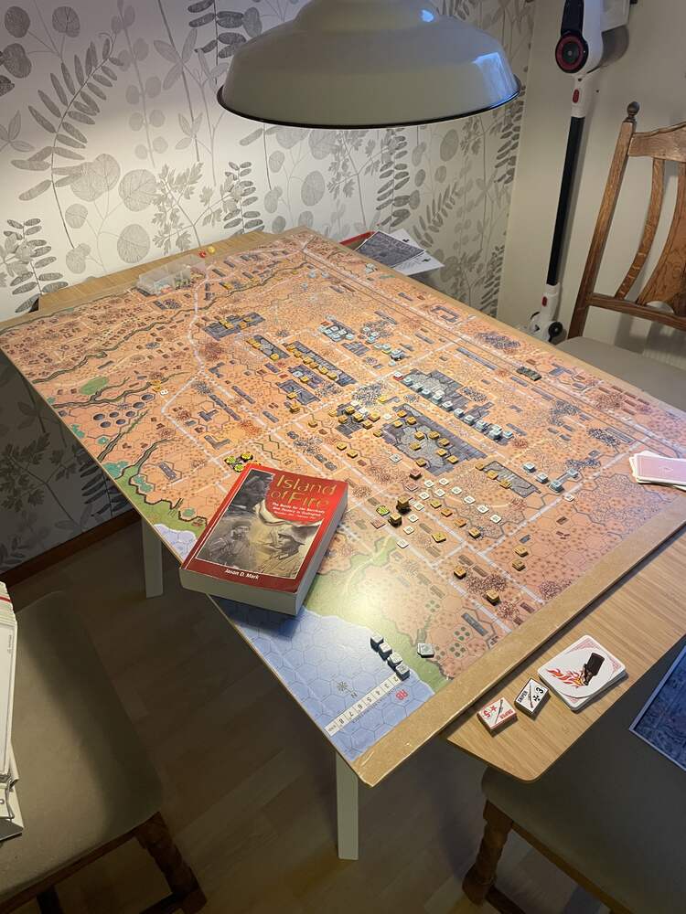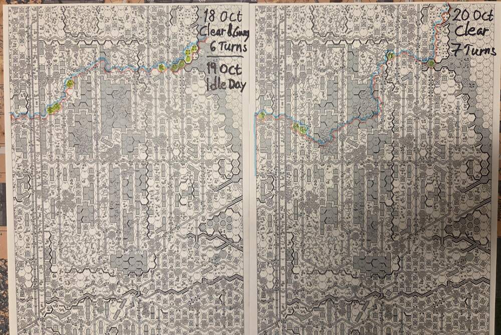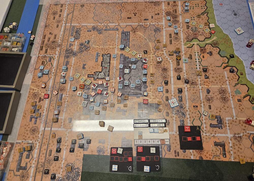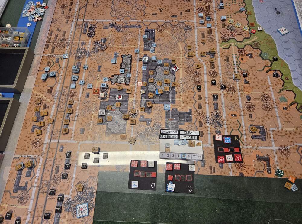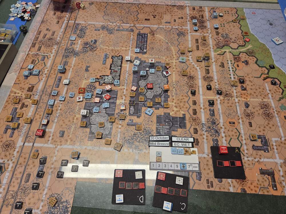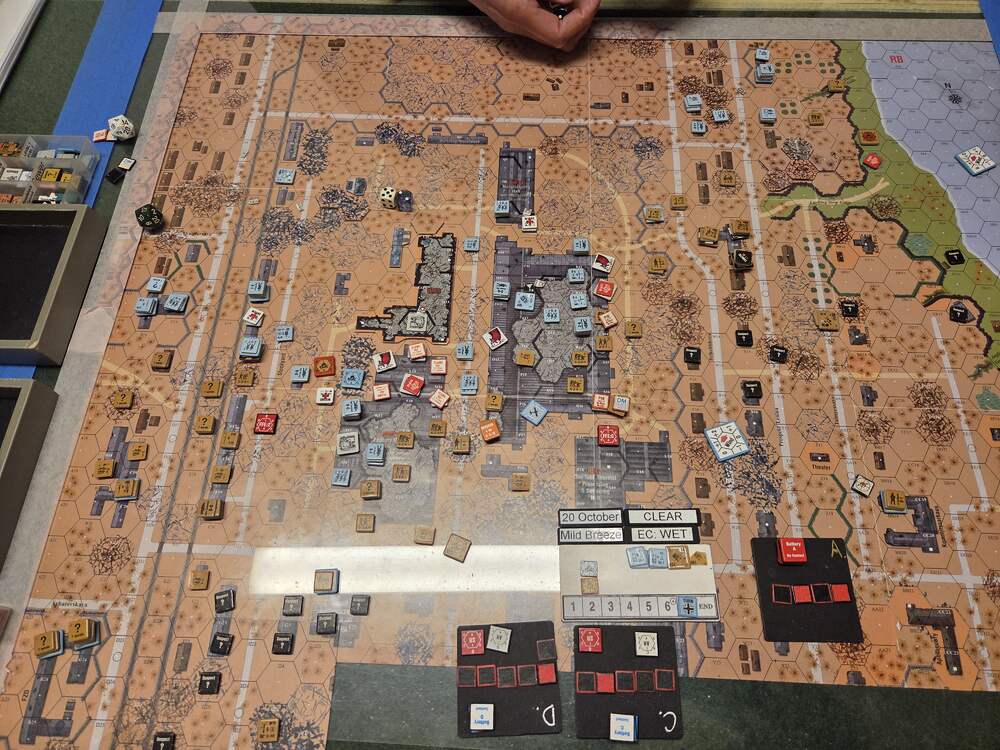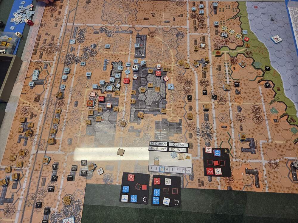 Day three - 19 Oct, Idle Day Day four - 20 Oct, German Assault, Clear, Wet, Mild Breeze. Germ Reinforcements 19 Oct - Idle Day Pionier 1st Coy (R), OBA: Btln MTR 80+mm, Pre-Reg Hex directed by an Offb'd Observer. Germ Reinforcements 20 Oct Rifle 4th Coy, OBA: Hvy Arty 150+mm, Pre-Reg Hex directed by a Spotter Plane. German OB (SAN:3) 17 Leaders, AFVs Pz IIIL, SPW 251/1, 53.5 sq-eq (8 AE, 8.5 Elite, 37 1st/2nd Line), 23 SWs (4 MMG, 9 LMG, 1 ATR, 2 Lt MTR, 3 FT, 4 DC). Russ Reinforcements 19 Oct - Idle Day Gds SMG 1st Coy (R), Militia 2nd Coy, Hvy Weapon 1st Pltn, OBA: Lt Arty 70+mm. Russ Reinforcements 20 Oct SMG 2nd Coy (R), Assault Engineers 1st Coy (R). Russian OB (SAN: 3) 18 Leaders, Guns 2x AT 45LL, 2x MTR 82mm, AFVs 2x Dug-In T-70, 96.5 Sq-eq (7 Crews, 9 AE, 13 Elite, 41.5 First Line, 29.5 Conscripts), 27 SWs (2 HMG, 4 MMG, 6 LMG, 3 ATR, 5 Lt MTR, 2 FT, 5 DC). AFTERMATH 20 Oct (7 Turns): After a day of uneasy respite, the Germans unleashed hell on the Red Barricades. A fresh Pionier company, prepared to lead the way signaled the start of the onslaught as flamethrowers fired volley after volley.. Supported by infantry companies and a Battalion Mortar, pre-registered artillery hammered the roofless factory hall, obliterating massed militia units. Flamethrowers belched liquid fire through shattered windows and doorways, igniting panic as German squads stormed in, methodically purging every shadow of Soviet resistance. In the vast central hall, Soviet defenders—emboldened by numbers—lay in wait prepared to contain the assault. But a 150mm artillery blasted their positions, spotted by a circling Fieseler Storch, turned confidence to catastrophe. Shells ripped through the structure in a storm of steel splinters and shockwaves, spiking casualties and vaporizing an entire rag-tag Militia company in minutes amid choking smoke and dust. The Soviets' 70mm guns fired two artillery mission before ammo starvation silenced them. Relentless German artilley blasts denied any breathing room, yielding massive terrain gains in the halls. Desperate Soviet counterthrusts sparked brutal close combats, often ending in mutual annihilation. The fresh experienced Pionier company bled 30% on its debut in the barrikady, all three flamethrowers immolated beyond recovery. Along the railway embankments, a Soviet probe crumbled under fire, only for a hasty German riposte to falter—pure stalemate. Volga Flank: A light mortar scored critical hits, erasing two German squads in the beginning. Raking MG fire from the Chemist Shop and a .50 cal HMG in the Commissar House shredded German outposts. Seizing momentum, the Russians counterattacked, reclaiming a few buildings and recaptured the Volga shoreline. Germ Casualties: 2 Leaders, 17.5 Squad-eq, 4 SW. Russ Casualties: 5 Leaders, 37.5 Squad-eq, 3 SWs. German OB, end of 20 Oct (SAN:2) 15 Leaders, AFVs Pz IIIL, SPW 251/1, 36 sq-eq (5.5 AE, 8.5 Elite, 22 1st/2nd Line), 23 SWs (4 MMG, 9 LMG, 2 Lt MTR, 4 DC). Russian OB, end of 20 Oct (SAN:2) 13 Leaders, Guns 2x AT 45LL, 2x MTR 82mm, AFVs 2x Dug-In T-70, 59 Sq-eq (5 Crews, 9 AE, 7 Elite, 26.5 First Line, 14 Conscripts), 24 SWs (1 HMG, 4 MMG, 5 LMG, 2 ATR, 5 Lt MTR, 2 FT, 5 DC). LOSSES 17-20 Oct (7+6+0+7= 20 Turns) Total German Casualties 8 Ldr, 44 Sq-Eq, 20 SWs, 5 AFVs. Total Russian Casualties 9 Ldr, 80 Sq-Eq, 14 SWs, 1 AFV.