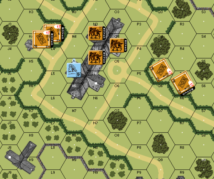Det är RtPh och German Leader A behöver Routa. Han väljer att routa ut ur det hus han är i och väljer då O7 som mål eftersom O7 är närmast och han ser ej de T34 som finns i Q5 och R5. När han på sin väg kommer till M6 upptäcker han T34 i R5 och får då inte fortsätta mot O7 eftersom han då kommer närmare denna T34. Nytt närmast mål är K8. Dock är det 5MF dit och ledaren har bara kvar 4MF. Får han routa mot K8 och hamna i K7 eller L7? Eller måste han stanna i M6? Om det var hus i L7 så att ha hunnit fram, hade han då kunnat fortsätta dit? Jag tolkar A10.51 som att han skulle få routa till hus i L7 men är osäker på om han får routa mot K8 då han inte hinner fram.