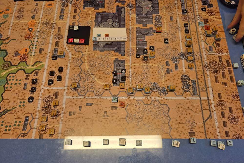 Day six - 22 Oct, Idle Day, Clear, Moderate, No Wind Germ Reinforcements Two Rifle 6th (R) & 7th (R) Coy, Hvy Weapon 2nd Pltn (R). Russ Reinforcements Gds SMG 2nd Coy (R), Assault Engineers 1st Coy (R). Day seven - 23 Oct, German Assault, Mist, Moist, Mild Breeze Germ Reinforcements (ELR:4, SAN:2) Rifle 8th Coy, Sturm 3rd Coy, OBA: Btln MTR 80+mm with an Offb'd Observer. Germ OB: 20 Leaders, Guns 2x GrW 34 AFVs 3x Pz IIIH, 93.5 sq-eq (11 Crews, 7.5 AE, 24.5 Elite, 56 1st/2nd Line), 44 SWs (3 HMG, 9 MMG, 16 LMG, 3 ATR, 5 Lt MTR, 1 FT, 7 DC). Russ Reinforcements (ELR:4, SAN:2) Gds Rifle 1st Coy (R), SMG 5th Coy (R), T-60 M42 Dug-In pltn, T-70 Dug-In pltn, Fortifications: 40 FPP, OBA: Btln MTR 80+mm with a Pre-Reg Hex. Russ OB: 22 Leaders, Guns 2x AT 45LL, MTR 82mm, AFVs 3x Dug-In T-60 M42, 6x Dug-In T-70, 111.5 Sq-eq (7 Crews, 9 AE, 30 Elite, 38.5 1st-Line, 30.5 Conscripts), 31 SWs (3 HMG, 6 MMG, 8 LMG, 2 ATR, 4 Lt MTR, 2 FT, 6 DC). AFTERMATH 23 Oct (7 Turns): Germ Cas: 2 Leaders, 16.5 Squad-eq, 6 SWs, 1 Gun. Russ Cas: 3 Leaders, 36.5 Squad-eq, 7 SWs, 1 Gun, 2 AFVs. German OB, end of 23 Oct (SAN:2) 18 Leaders, Gun GrW 34 AFVs 3x Pz IIIH, 77 sq-eq (10nCrews, 7.5 AE, 24 Elite, 40.5 1st/2nd Line), 38 SWs (1 HMG, 7 MMG, 16 LMG, 2 ATR, 4 Lt MTR, 1 FT, 7 DC). Russian OB, end of 23 Oct (SAN:2) 19 Leaders, Guns 2x AT 45LL, AFVs 2x Dug-In T-60 M42, 5x Dug-In T-70, 75 Sq-eq (4 Crews, 8 AE, 20 Elite, 25.5 1st-Line, 19.5 Conscripts), 24 SWs (3 HMG, 4 MMG, 8 LMG, 1 ATR, 2 Lt MTR, 1 FT, 5 DC). LOSSES 17-23 Oct (6+7+7+6+7+0+7= 40 Turns) Total Germ Cas: 16 Ldr, 69 Sq-Eq, 33 SWs, 3 Guns, 6 AFVs. Total Russ Cas: 16 Ldr, 146 Sq-Eq, 32 SWs, 4 Guns, 5 AFVs.