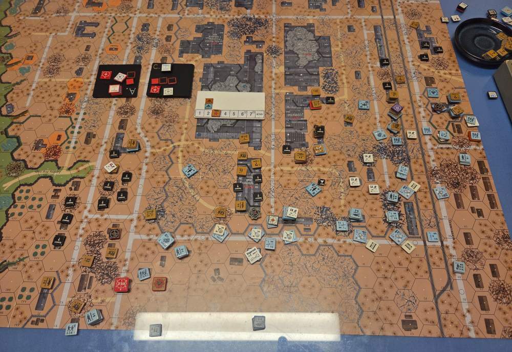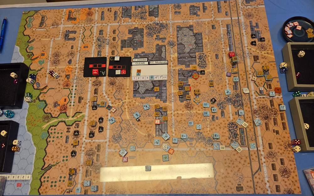Day three - 19 Oct, German Assault, Clear, Moist, no wind Germ Reinforcements (ELR:4, SAN:2) Sturm 3rd Coy, Stuka (3), OBA: Btln MTR 80+mm with Offb'd Observer and Pre-Reg Hex A15. OBA: Btln MTR 80+mm 8-0 Ldr with Phone on roof M11. Germ OB: 16 Leaders, AFVs 3x Pz IIIL, 1x Pz IIIH, 3x SPW 251/1, 50.5 sq-eq (27 Elite, 23.5 1st/2nd Line), 22 SWs (6 MMG, 11 LMG, 1 ATR, 2 Lt MTR, 2 DC). Russian Reinforcements (ELR:3, SAN:3) Rifle 5th Coy (R), Gds SMG 1st Coy (R), T-70 pltn Dug-In & HIP, SAN Increase, OBA: Two Lt Arty 70+mm. Russian OB 13 Leaders, Guns 3x AT 45mm, AFVs 3x T-70, 66 Sq-eq (5 Crews, 11.5 Elite, 36.5 1st-Line, 15.5 Conscripts), 16 SWs (3 MMG, 5 LMG, 4 ATR, 3 Lt MTR, 1 DC). AFTERMATH 19 Oct (6 Turns): For the third consecutive day, the Germans pressed their assault into the factory halls. Now reinforced by two btln morter batteries and Stuka dive-bombers screaming down onto the Soviet defenders, the attack gained fresh momentum. Despite being steadily forced back, the Red Army troops inside the factories refused to break; they clung tenaciously to their positions under crushing pressure from two German sturm coy that pushed forward with grim determination, but many German leaders were either wounded or killed at the factory floor. In the Volga riverbank sector, a fullstrength company of front-line German infantry achieved a surprising success: after a shoot-out and intense close-quarters fighting, they succeeded in clearing the Soviets from the strongly contested “Chemist’s Shop” building. Along the railway embankment, however, the front line remained deadlocked. Germ Casualties: 7 Leader, 14.5 Squad-eq, 4 SWs, 2 AFVs. Russ Casualties: 0 Leader, 27.5 Squad-eq, 7 SWs, 2 Guns, 1 AFV. German OB, end of 19 Oct (SAN:2) 9 Leaders, AFVs 2x Pz IIIL, 3xSPW 251/1, 36 sq-eq (22 Elite, 14 1st/2nd Line), 18 SWs (6 MMG, 8 LMG, 2 Lt MTR, 2 DC). Russian OB, end of 19 Oct (SAN:2) 13 Leaders, Guns AT 45mm, AFVs 2x T-70, 38.5 Sq-eq (2 Crews, 10.5 Elite, 18.5 1st-Line, 8.5 Conscripts), 9 SWs (1 MMG, 4 LMG, 2 ATR, 1 Lt MTR, 1 DC). LOSSES 17-19 Oct (6+6+6= 18 Turns) Total German Casualties: 12 Ldr, 36 Sq-Eq, 13 SWs, 5 AFVs (one Recall). Total Russian Casualties: 5 Ldr, 75.5 Sq-Eq, 17 SWs, 5 Guns, 1 AFV.