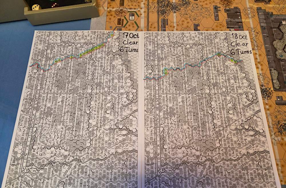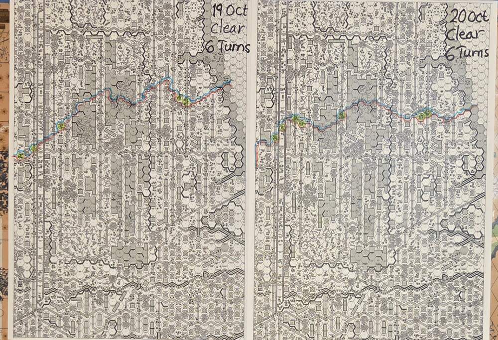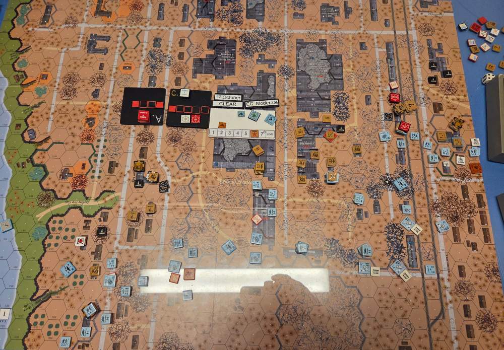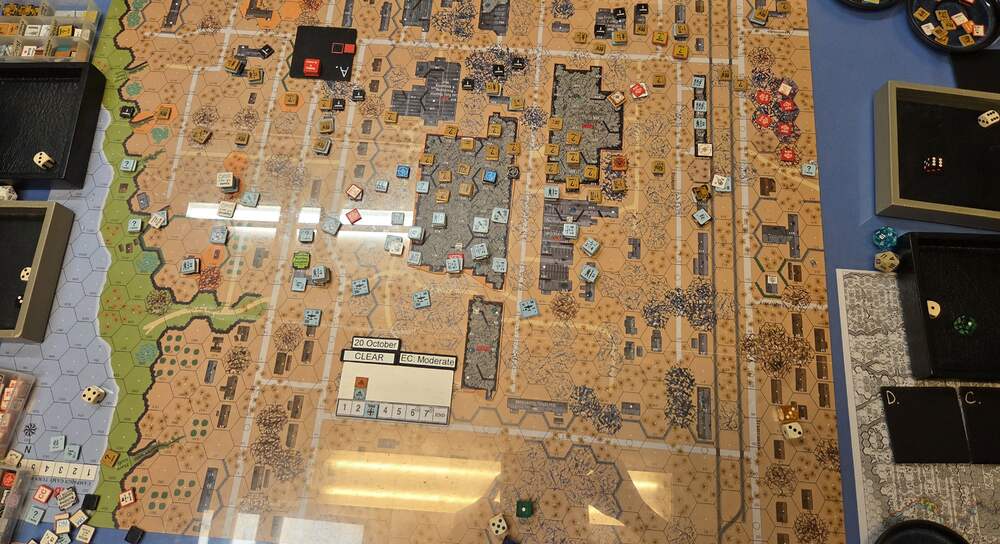 Day four - 20 Oct, German Assault, Clear, Moderate, no wind Germ Reinforcements (ELR:4, SAN:2) Sturm 4th Coy, Early Stuka (4), INF Gun Battery. Germ OB: 12 Leaders, Guns 3x INF 75mm, INF 150mm, AFVs 2x Pz IIIL, 3xSPW 251/1, 50 sq-eq (4 Crews, 34 Elite, 14 1st/2nd Line), 23 SWs (7 MMG, 10 LMG, 2 Lt MTR, 4 DC). Russian Reinforcements (ELR:3, SAN:3) Rifle 6th Coy (R), Militia 2nd Coy, Heavy Weapon 1st Pltn, OBA: Lt Arty 70+mm (retained), Fortifications 40 FPP. Russian OB 15 Leaders, Guns 2x MTR 82mm, AT 45mm, AFVs 2x T-70, 68.5 Sq-eq (8 Crews, 10.5 Elite, 30.5 1st-Line, 23.5 Conscripts), 18 SWs (2 HMG, 4 MMG, 6 LMG, 3 ATR, 2 Lt MTR, 1 DC). AFTERMATH 20 Oct (6 Turns): The German had brought four INF Guns during the night to the front line as support. Despite that, the German assault stalled almost immediately, and bloodied along the entire front line, the attackers also suffered more casualties from Russian counterattacks and plenty of booby traps. One Pz III was recalled and the other wrecked. Subsequent new German assaults were often repelled, and the front line advanced hardly at all or just a little forward during the day’s fighting. Germ Casualties: 1 Leader, 13 Squad-eq, 6 SWs, 1 Gun, 2 AFVs (one Recall). Russ Casualties: 2 Leader, 15 Squad-eq, 5 SWs, 2 Guns, 2 AFVs. German OB, end of 20 Oct (SAN:2) 11 Leaders, Guns 3x INF 75mm, AFVs 3xSPW 251/1, 37 sq-eq (3 Crews, 25.5 Elite, 10 1st/2nd Line), 17 SWs (5 MMG, 8 LMG, 1 Lt MTR, 3 DC). Russian OB, end of 20 Oct (SAN:2) 13 Leaders, Guns AT 45mm, 53.5 Sq-eq (6 Crews, 7.5 Elite, 29.5 1st-Line, 13.5 Conscripts), 13 SWs (2 HMG, 3 MMG, 5 LMG, 2 ATR, 1 Lt MTR). LOSSES 17-20 Oct (6+6+6+6= 24 Turns) Total German Casualties: 13 Ldr, 49 Sq-Eq, 19 SWs, 1 Gun, 7 AFVs (two Recalled). Total Russian Casualties: 7 Ldr, 90.5 Sq-Eq, 22 SWs, 7 Guns, 3 AFVs.