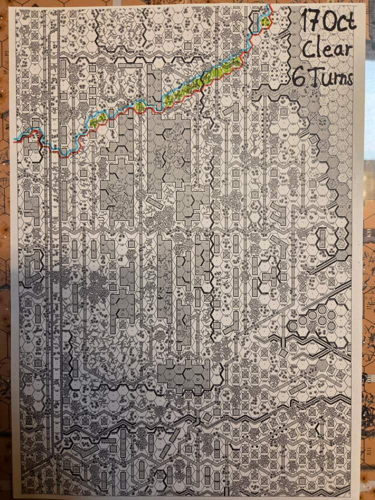 Day 10 (of 11) - 26 October, German Assault, Clear, Dry, No Wind Germ Reinforcements: Sturm 5th Coy, OBA: Hvy Arty 150+mm directed by Spotter Plane, Early STUKA (4). German OB (ELR:4, SAN:2) 17 Ldr, Guns PaK 40, GrW 34, INF 75mm, 61 Sq-eq (4 Crews, 2 AE, 22.5 Elite, 34.5 1st/2nd-Line), 40 SWs (2 HMG, 7 MMG, 21 LMG, 1 ATR, 2 Lt MTR, 2 FT, 5 DC). Russ Reinforcements: Gds SMG 3rd Coy (R), ART Gun Battery, Fort 160 FPP. OBA id: A, Btln MTR 80+mm with Pre-Reg Hex (Retained), OBA id: B, Btln MTR 80+mm. Russian OB (ELR:3, SAN:2) 16 Ldr, Guns AT 45mm, 2x MTR 82mm, 4x ART 76L, 75 Sq-eq (17 Crews, 1.5 AE, 24 Elite, 29.5 1st-Line, 11.5 Conscripts), 26 SW (4 HMG, 6 MMG, 6 LMG, 1 ATR, 5 Lt MTR, 4 DC). AFTERMATH (6 Turns): Germ Cas: 5 Ldr, 16.5 Sq-eq, 7 SWs. Russ Cas: 3 Ldr, 35.5 Sq-eq, 11 SWs, 4 Guns. German OB, end of 26 Oct (SAN:2) 14 17 Ldr, Guns PaK 40, GrW 34, INF 75mm, 61 Sq-eq (4 Crews, 2 AE, 22.5 Elite, 34.5 1st/2nd-Line), 40 SWs (2 HMG, 7 MMG, 21 LMG, 1 ATR, 2 Lt MTR, 2 FT, 5 DC). Russian OB, end of 26 Oct (SAN:2) 13 Ldr, Guns MTR 82mm, 2x ART 76L, 39.5 Sq-eq (12 Crews, 1 AE, 13.5 Elite, 13.5 1st-Line, 5.5 Conscripts), 15 SW (3 HMG, 2 MMG, 5 LMG, 3 Lt MTR, 2 DC). LOSSES 17-26 Oct (6+6+6+0+6+6+6+6+6+6= 54 Turns) Total German Casualties: 35 Ldr, 134 Sq-Eq, 53 SWs, 6 Guns, 3 AFVs. Total Russian Casualties: 30 Ldr, 253.5 Sq-Eq, 64 SWs, 13 Guns, 9 AFVs.
