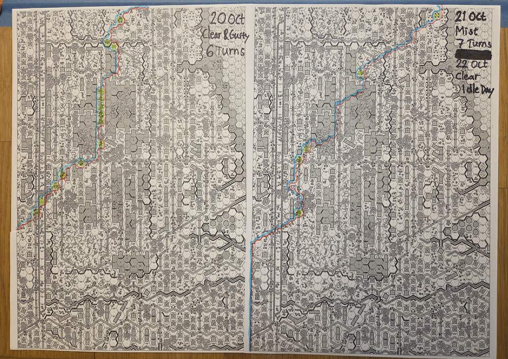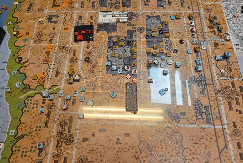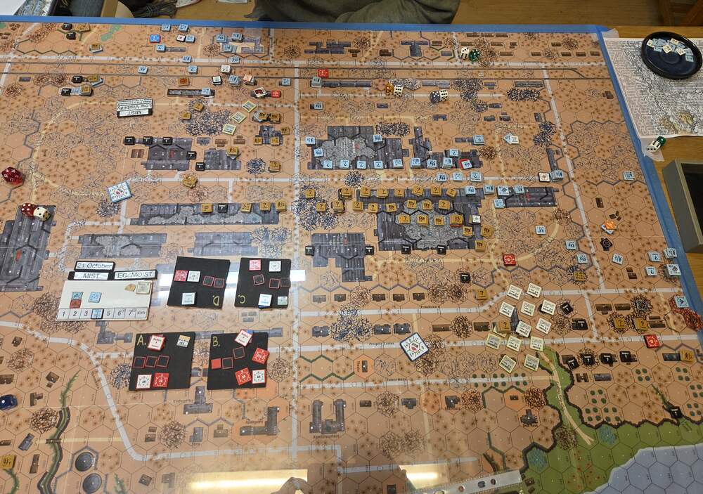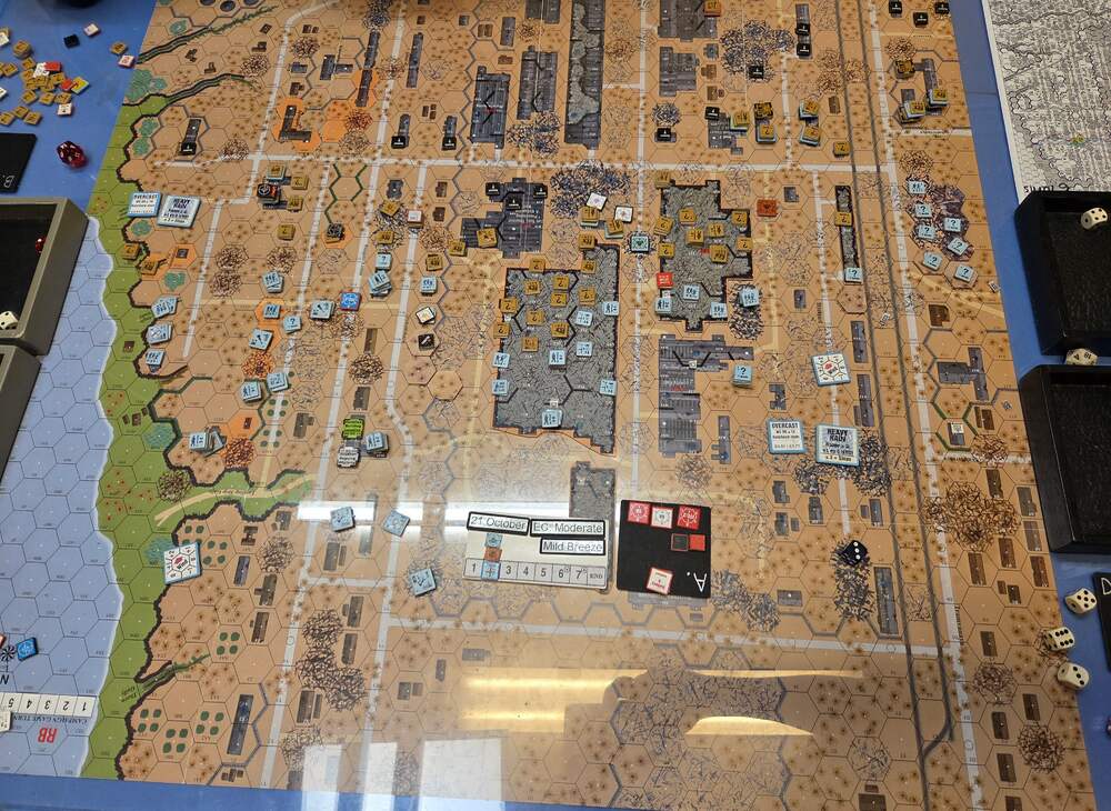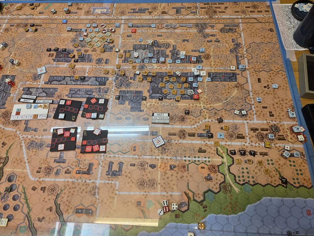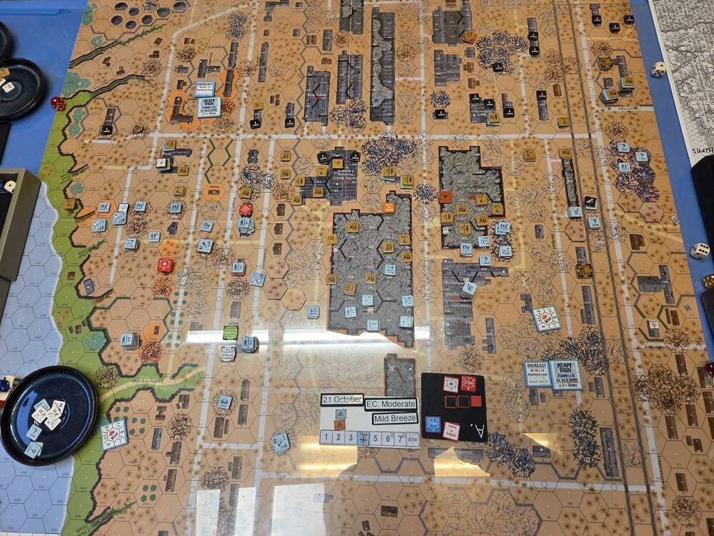 Day five - 21 Oct, German Assault, Mist, Moist, Mild Breeze Germ Reinforce (ELR:4, SAN:2) Rifle 5th Coy, Pz IIIH Pltn, OBA: Two Btln MTR 80+mm each with an Offb'd Observer an one with a Pre-Reg Hex. Germ OB: 11 Leaders, Guns MTR 81mm, AFVs Pz IIIL, 4x Pz IIIH, 59 sq-eq (6 Crews, 8 AE, 10 Elite, 38 1st/2nd-Line), 30 SWs (1 HMG, 5 MMG, 12 LMG, 1 ATR, 3 Lt MTR, 3 FT, 5 DC). Russ Reinf (ELR:3, SAN:2) Militia 4th Coy, SMG 4th Coy (R), Gds SMG 1st Coy, OBA: Two Btln MTR 80+mm and one with a Pre-Reg Hex. Russ OB: 16 Leaders, Guns 2x AT 45LL, MTR 82mm, AFVs 3x Dug-In T-70, 95.5 Sq-eq (10 Crews, 10 Elite, 41.5 1st-Line, 39 Conscripts), 17 SWs (3 HMG, 6 MMG, 3 LMG, 1 ATR, 3 Lt MTR, 1 DC). AFTERMATH 21 Oct (7 Turns): Germ Cas: 2 Leaders, 16.5 Squad-eq, 10 SWs, 1 Gun, 2 AFVs. Russ Cas: 2 Leaders, 23 Squad-eq, 3 SWs. German OB, end of 21 Oct (SAN:2) 9 Leaders, AFVs 3x Pz IIIH, 42.5 sq-eq (5 Crews, 7.5 AE, 12.5 Elite, 20 1st/2nd Line), 20 SWs (1 HMG, 3 MMG, 8 LMG, 2 Lt MTR, 1 FT, 5 DC). Russian OB, end of 21 Oct (SAN:2) 14 Leaders, Guns 2x AT 45LL, MTR 82mm, AFVs 3x Dug-In T-70, 72.5 Sq-eq (7 Crews, 9 Elite, 29.5 1st-Line, 30.5 Conscripts), 14 SWs (3 HMG, 5 MMG, 3 LMG, 2 Lt MTR, 1 DC). LOSSES 17-21 Oct (6+7+7+6+7= 33 Turns) Total Germ Cas: 14 Ldr, 52.5 Sq-Eq, 27 SWs, 2 Guns, 6 AFVs. Total Russ Cas: 13 Ldr, 109.5 Sq-Eq, 25 SWs, 3 Guns, 3 AFVs.