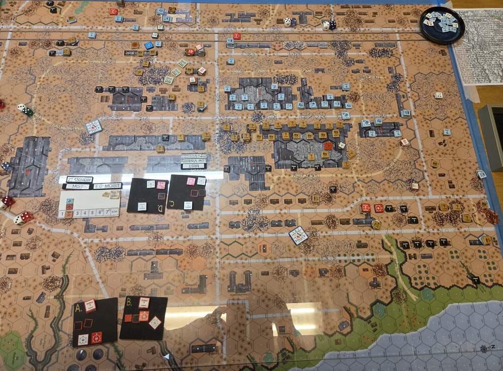 Day two - 18 Oct, German Assault, Clear, Moist, no wind Germ Reinforcements (ELR:4, SAN:3) Rifle 2nd & 3rd Coy, Stuka (3), SAN increase. Germ OB: 14 Leaders, AFVs 3x Pz IIIL, 2x Pz IIIH, 3x SPW 251/1, 50 sq-eq (22 Elite, 28 1st/2nd Line), 22 SWs (5 MMG, 9 LMG, 3 ATR, 3 Lt MTR, 2 DC). Russian Reinforcements (ELR:3, SAN:2) Rifle 4th Coy (R), SMG 3rd Coy (R), Militia 1st Coy, Anti-Tank Gun Battery, OBA: Btln MTR 80+mm. Russ OB: 10 Leaders, Guns 5x AT 45mm, 69 Sq-eq (6 Crews, 2 Elite, 42.5 1st-Line, 21.5 Conscripts), 12 SWs (2 MMG, 3 LMG, 4 ATR, 3 Lt MTR). AFTERMATH 18 Oct (6 Turns): The German assault continued into its second day in the Barrikady district. Along the railway embankments, the advance was halted with no significant progress, as Russian battalion artillery relentlessly pounded the German Schwerpunkt assault groups. The only gain was control of the abandoned "triangle house," previously held by the Soviets. Within the factory complex, German forces pushed forward aggressively, inflicting heavy casualties on the defenders. In the Volga sector, they advanced and gained control of more terrain and established a perimeter just outside the Chemist's Shop building. The key to take for any further progress along the Volga sector. Germ Casualties: 4 Leader, 11.5 Squad-eq, 5 SWs, 1 AFVs. Russ Casualties: 1 Leader, 24 Squad-eq, 2 SWs, 2 Guns. German OB, end of 18 Oct (SAN:2) 10 Leaders, AFVs 3x Pz IIIL, 1x Pz IIIH, 3x SPW 251/1, 38.5 sq-eq (15 Elite, 23.5 1st/2nd Line), 17 SWs (5 MMG, 9 LMG, 1 ATR, 2 Lt MTR). Russian OB, end of 18 Oct (SAN:2) 9 Leaders, Guns 3x AT 45mm, 45 Sq-eq (5 Crews, 2.5 Elite, 24.5 1st-Line, 15.5 Conscripts), 10 SWs (2 MMG, 3 LMG, 3 ATR, 2 Lt MTR). LOSSES 17-18 Oct (6+6= 12 Turns) Total German Casualties: 5 Ldr, 21.5 Sq-Eq, 9 SWs, 3 AFVs (one Recall). Total Russian Casualties: 5 Ldr, 48 Sq-Eq, 10 SWs, 3 Guns.