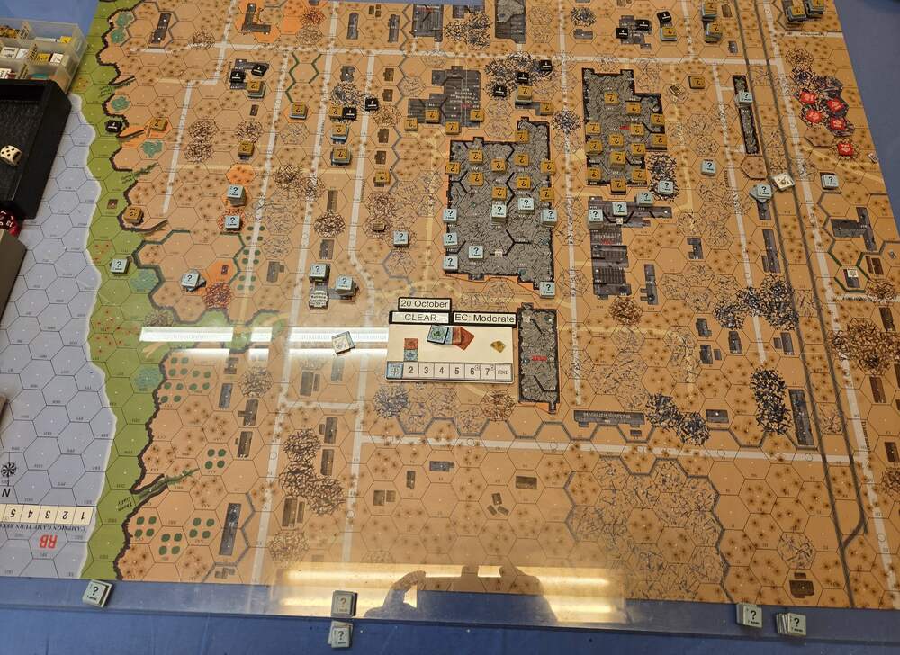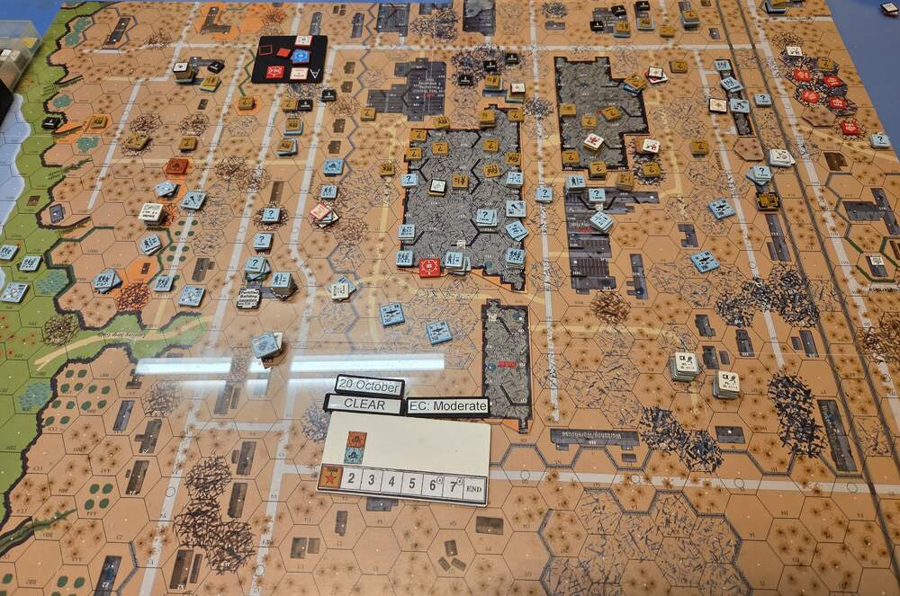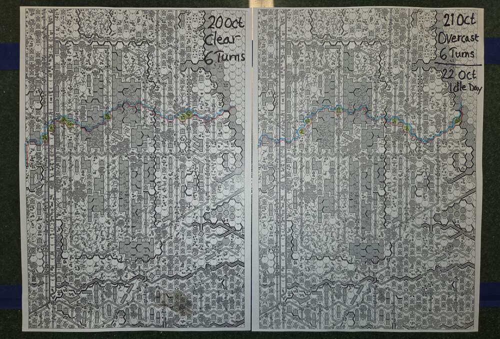 Day four - 20 Oct, German Assault, Clear & Gusty, Moist, No Wind German Reinforcements (ELR:4, SAN:3) Assault Engineers 1st Coy. Germ OB: 10 Leaders, Guns MTR 81mm, AFVs Pz IIIL, Pz IIIH, 54.5 sq-eq (6 Crews, 8 AE, 12.5 Elite, 31 1st/2nd-Line), 29 SWs (1 HMG, 4 MMG, 14 LMG, 2 Lt MTR, 3 FT, 5 DC). Russian Reinforcements (ELR:3, SAN:2) Rifle 6th Coy (R), Militia 3rd Coy, Hvy Wpn 2nd Pltn, Fortifications 40 FPP. Russ OB: 14 Leaders, Guns 2x AT 45LL, 3x MTR 82mm, AFVs 3x T-70, 82.5 Sq-eq (12 Crews, 1 Elite, 40 1st-Line, 35.5 Conscripts), 18 SWs (3 HMG, 7 MMG, 3 LMG, 2 ATR, 3 Lt MTR). AFTERMATH 20 Oct (6 Turns): Germ Cas: 2 Leaders, 7.5 Squad-eq, 4 SWs. Russ Cas: 2 Leaders, 20 Squad-eq, 2 SWs, 2 Guns. German OB, end of 20 Oct (SAN:2) 8 Leaders, Guns MTR 81mm, AFVs Pz IIIL, Pz IIIH, 47 sq-eq (6 Crews, 8 AE, 10 Elite, 26 1st/2nd-Line), 25 SWs (1 HMG, 4 MMG, 10 LMG, 2 Lt MTR, 3 FT, 5 DC). Russian OB, end of 20 Oct (SAN:2) 12 Leaders, Guns 2x AT 45LL, MTR 82mm, AFVs 3x T-70, 62.5 Sq-eq (10 Crews, 1 Elite, 32.5 1st-Line, 24 Conscripts), 16 SWs (3 HMG, 6 MMG, 3 LMG, 1 ATR, 3 Lt MTR). LOSSES 17-20 Oct (6+7+7+6= 26 Turns) Total Germ Cas: 12 Ldr, 36 Sq-Eq, 17 SWs, 1 Gun, 4 AFVs. Total Russ Cas: 9 Ldr, 86.5 Sq-Eq, 22 SWs, 3Guns, 3 AFVs.
