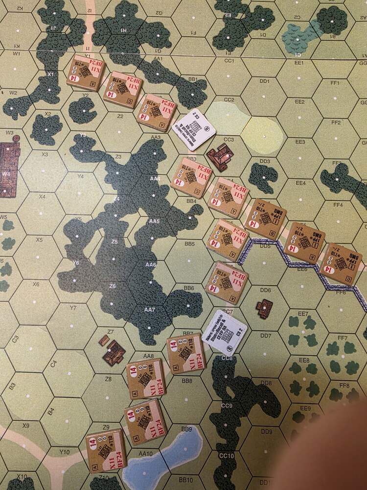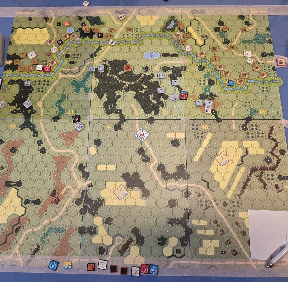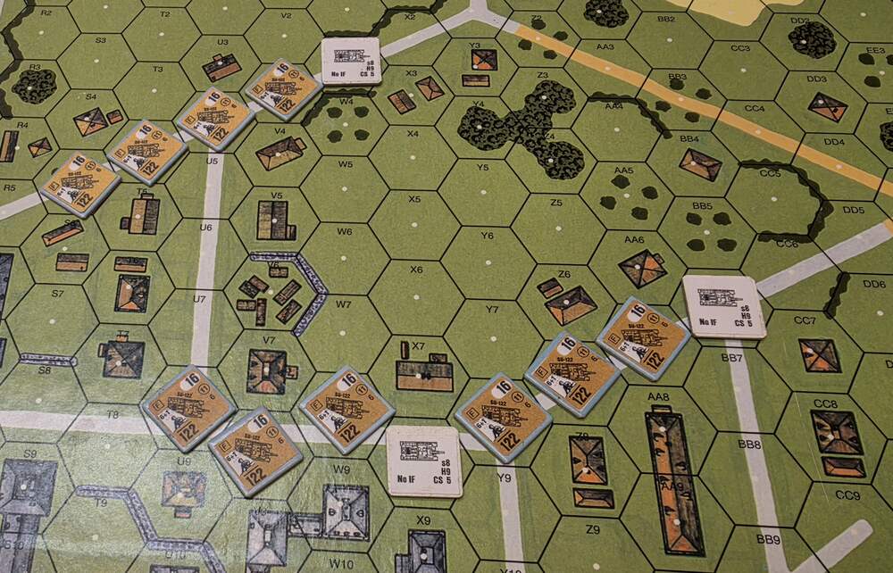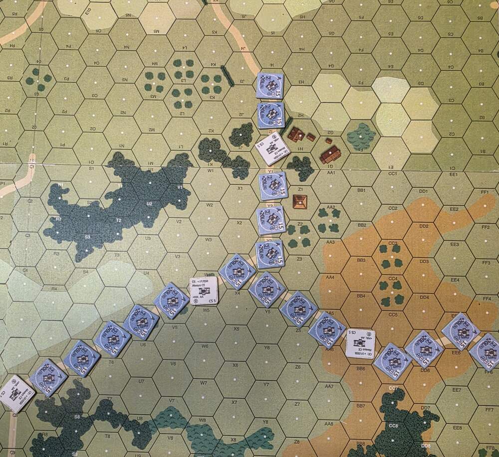 Måste till att slå DR 2 to 5 (27%) för att bli av med Stukan och får inte stå i hus för att kunna gå i AA-läge. Om MMC med 50. Cal HMG inte flyttar fram. Då får man fundera om Stukan kan anfalla en Ryss AFV 9 hexes bort eller om blind hex gör att 50. Cal inte kan attackera Stukan. Men bra byte 50. cal HMG flyttas inte fram och Stukan avstår från att anfalla, eller den anfaller och 50 cal missar 73% chans och har dessutom inte gått fram. Roadblock står långt fram på tysk vänsterflank. Båda FlaK 88L & 37L står långt bak. PSK grupper skyddar dem, tysk Sniper sätter även den upp i det bakre området.