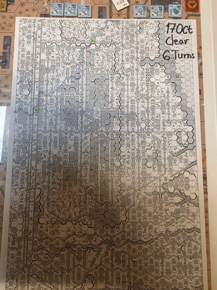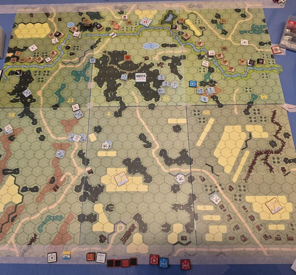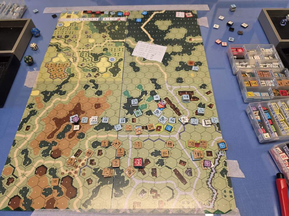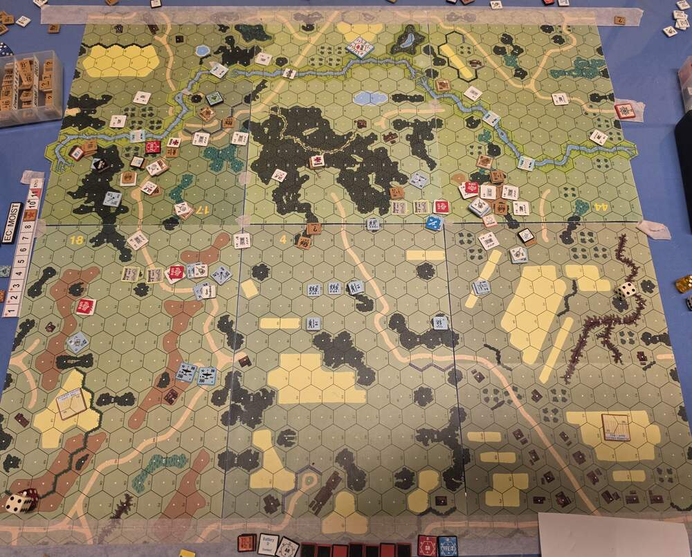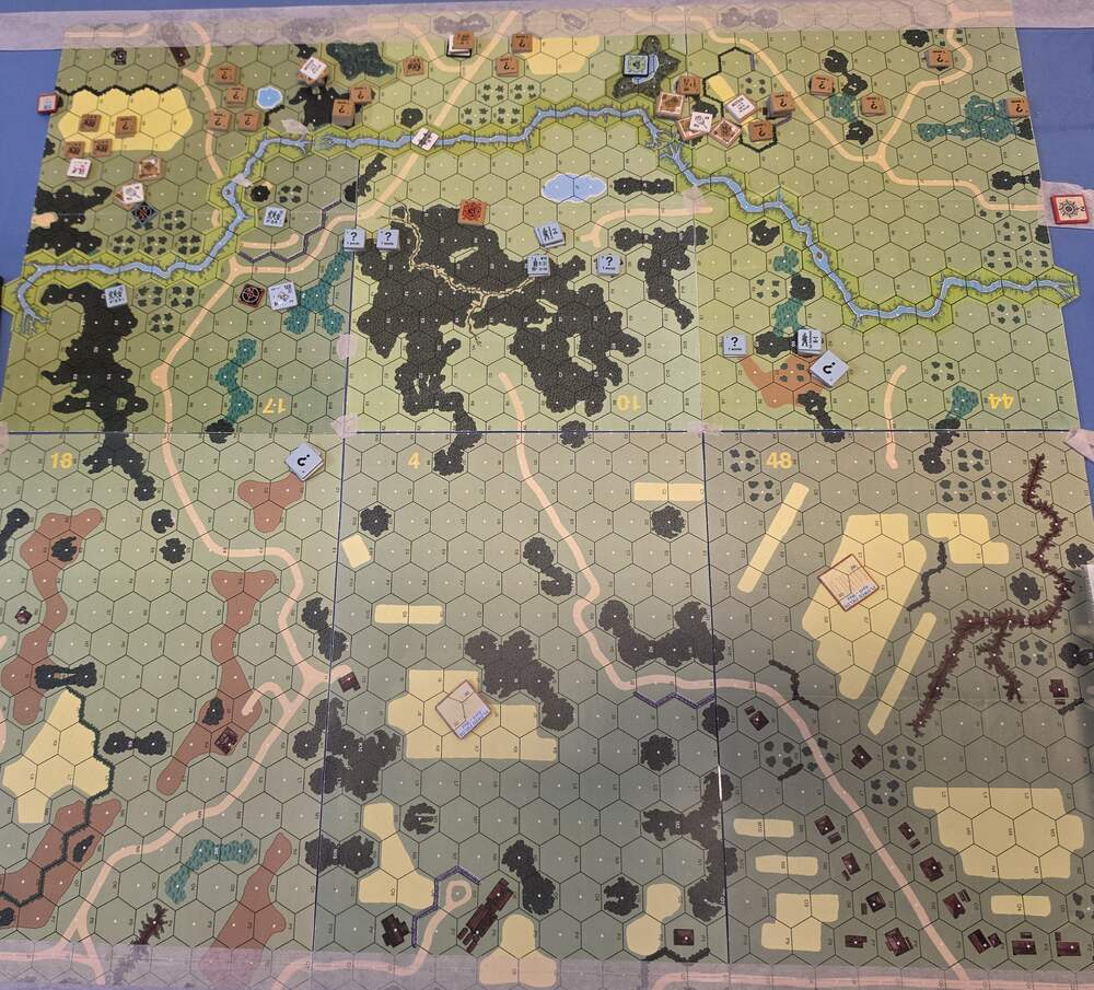Måste till att slå DR 2 to 5 (27%) för att bli av med Stukan och får inte stå i hus för att kunna gå i AA-läge. Om MMC med 50. Cal HMG inte flyttar fram. Då får man fundera om Stukan kan anfalla en Ryss AFV 9 hexes bort eller om blind hex gör att 50. Cal inte kan attackera Stukan. Men bra byte 50. cal HMG flyttas inte fram och Stukan avstår från att anfalla, eller den anfaller och 50 cal missar 73% chans och har dessutom inte gått fram. Roadblock står långt fram på tysk vänsterflank. Båda FlaK 88L & 37L står långt bak. PSK grupper skyddar dem, tysk Sniper sätter även den upp i det bakre området.