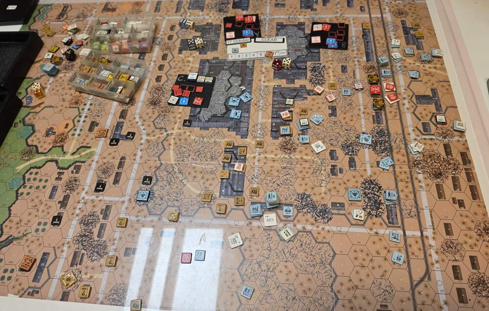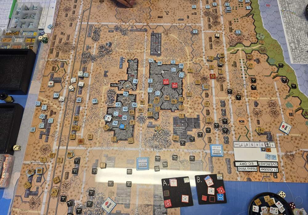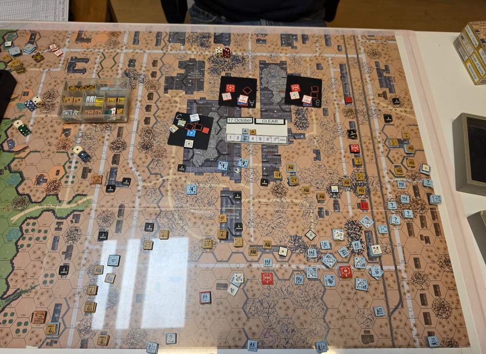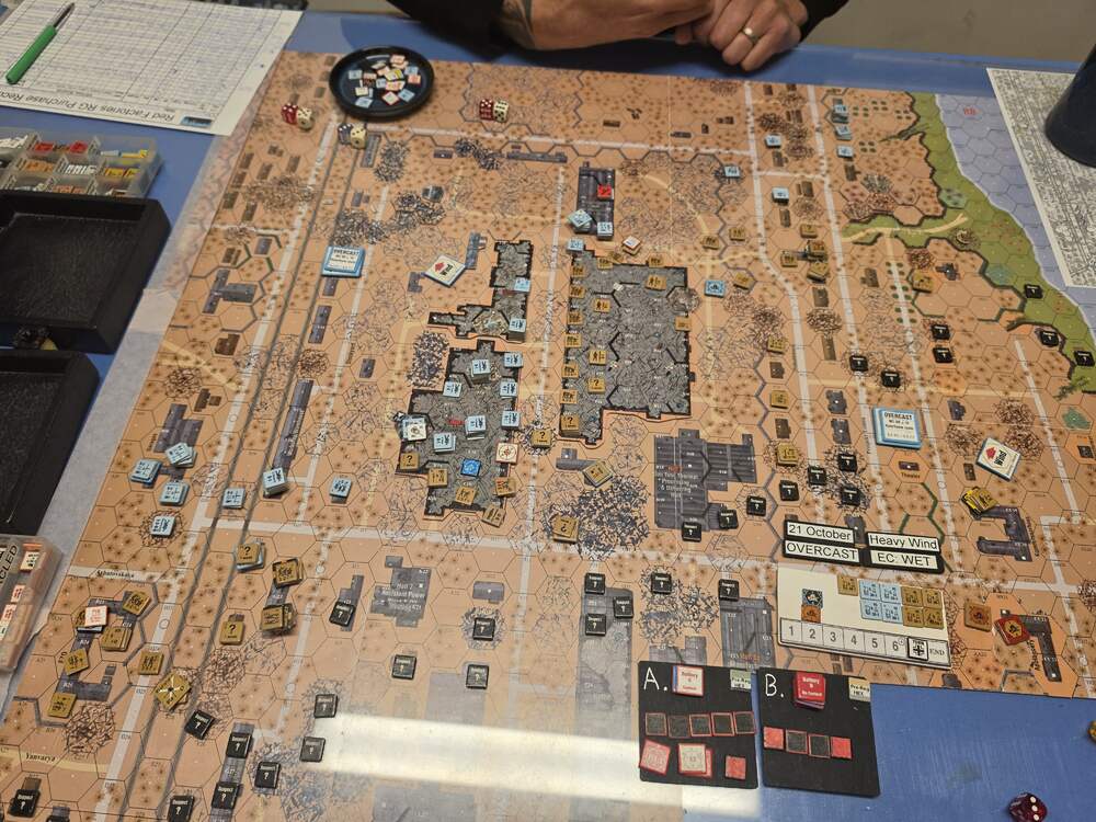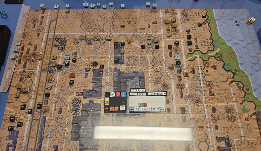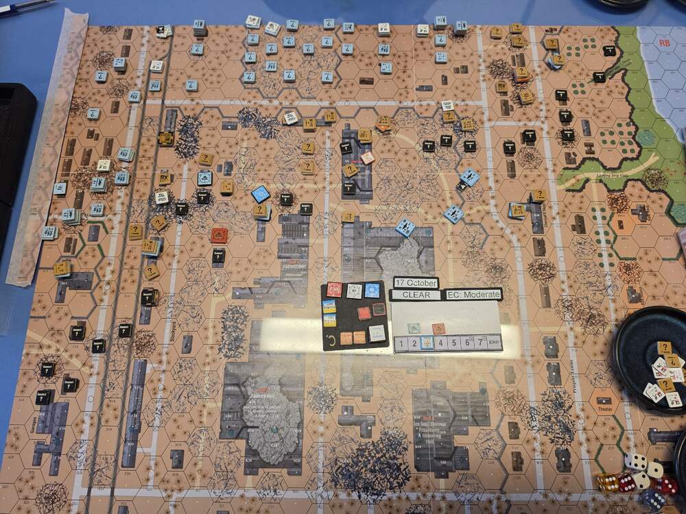 Day one - 17 Oct, German Assault, Clear, Moderate, no wind German at start OB (ELR:4, SAN:3) Rifle 1st Coy, Sturm 1st & 2nd Coy, Pz IIIL pltn, Two SPW pltn, Stuka (4), OBA: Btln MTR 80+mm, two Pre-Registered Hexes & Offb´d Observer. Germ OB: 8 Leaders, AFVs 3 Pz IIIL, 6 SPW 251/1, 2 SPW 251/10, 36 sq-eq (24x 5-4-8 Elite, 12x 4-6-7 First Line), 17 SWs (3 MMG, 6 LMG, 3 ATR, 1 Lt MTR, 4 DC). Russian at start OB (ELR:3, SAN:4) Rifle 1st & 2nd & 3rd (R) Coy, SMG 1st Coy, T-70 Dug-In pltn, OBA: Btln MTR 80+mm, OBA: Lt Arty 70+mm, 50 FPP & 5 Fort Loc. Russ OB 8 Leaders, AFVs 3 Dug-In T-70, Guns 2 AT 45LL, 46 Sq-eq (2x 228 Crews, 36x 4-4-7 1st-Line, 9x 5-2-7 1st-Line), 15 SWs (3 MMG, 6 LMG, 3 ATR, 3 Lt MTR). AFTERMATH (6 Turns): The Germans prepared for their assault into the Barrikady Factory district. The attack would be spearheaded by two Sturm companies and one rifle company — a shock force of roughly 350 battle-hardened soldiers from the 6th Army. They were supported by a platoon of three Panzer IIIL, six SPW 251/1 half-tracks, and two SPW 251/10 command vehicles mounting 3.7 cm PaK guns. Overhead, Stuka dive-bombers circled, while observed artillery fire had been planned to soften the Soviet defenses. Opposing them, the Soviets had dug in with approximately 350 men in the forward line and another 120 in the second defense line— a total defensive strength of nearly 500 troops. Their defense had support by two AT 45mm and three dug-in, hidden T-70 tankettes. Soviet Lt 70+mm artillery aimed to fire in front of Chemist Shop at German entry points closest to the Volga. Another OBA 80+mm targeted area around the railway embankments. At first light, the German soldiers advanced into the barrikady district. Eight Panzer half-tracks raced forward, packed with Stoßtruppen — heading straight for the Russian frontline in the center. The assault quickly gained momentum. German panzers and half-tracks cut off Soviet retreat paths, forcing the defenders out into the open where Stukas screamed down and targeted them. Soviet artillery in the Volga sector called down artillery blast at the German infantry that canceled their push in that sector and withdrew off-board toward their starting positions. In the western sector, however, the assault pressed on relentlessly. German troops advanced forward. The Soviets either retreated in disorder or stood and fought to the death, often cut off by German armor. A Russian anti-tank gun revealed itself and fired twenty rounds at an immobilized SPW hull-down by the embankment after a Russ squad had attacked it in CC, the failure led the squad to be eliminated by the SPW. Finally a hit in the upper part of the SPW made it explode in a fireball, shortly thereafter the AT gun was captured and its crew eliminated. A dug-in T-70 was discovered by German infantry and quickly eliminated by a Panzer IIIL. Another Pz IIIL was shocked and by an ATR hit and never recovered and thereby wrecked. Then, suddenly, the German storm tactics ground to a halt. Ammunition shortages, worsened by the brutal attrition of house-to-house fighting. As the assault waves paused to resupply, a radio message crackled from the rear: the battalion cook reported that supper was ready. Exhausted soldiers exchanged grim, ironic glances. In the midst of hell, Germ Casualties: 0 Ldr, 6.5 Squad-equivalents, 2 SWs, 5 AFVs. Russ Cas: 2 Ldr, 18.5 Squad-equivalents, 6 SWs, 1 Gun, 1 AFV. Germ OB, end of 17 Oct (SAN:3) 8 Ldr, AFVs 1 Pz IIIL, 3 SPW 251/1, 2 SPW 251/10, 29.5 Squad-equivalents (21 Elite, 8.5 1st/2nd-Line), 15 SWs (3 MMG, 6 LMG, 2 ATR, 1 Lt MTR, 3 DC). Russ OB, end of 17 Oct (SAN:3) 6 Leaders, AFVs 2 Dug-In T-70, Guns AT 45LL, 27.5 Squad-equivalents (1 Crew, 27 1st-Line), 9 SWs (2 MMG, 4 LMG, 2 ATR, 1 Lt MTR).