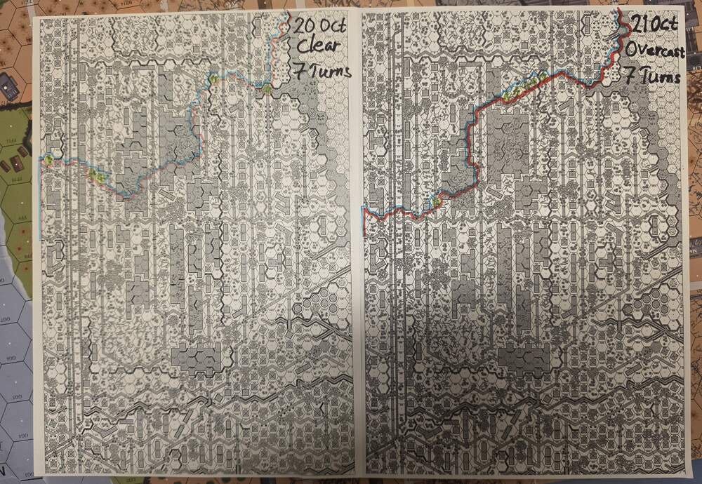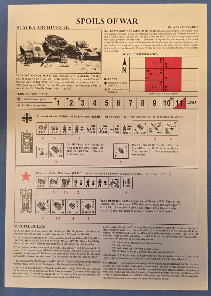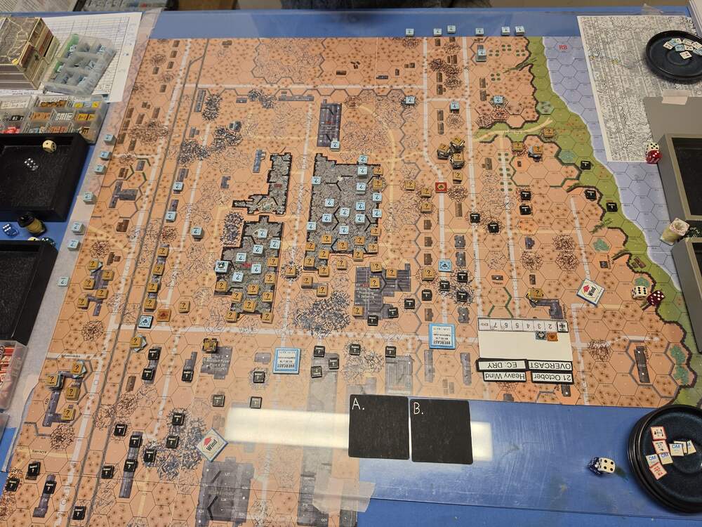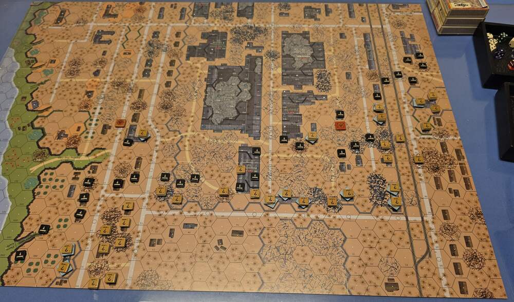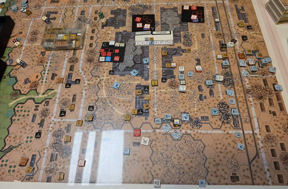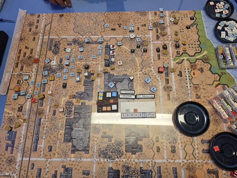 Day one - 17 Oct, German Assault, Clear, Moderate, no wind German at start OB (ELR:4, SAN:3) Rifle 1st Coy, Sturm 1st & 2nd Coy, Pz IIIL pltn, Two SPW pltn, Stuka (4), OBA: Btln MTR 80+mm, two Pre-Registered Hexes & Offb´d Observer. Germ OB: 8 Leaders, AFVs 3 Pz IIIL, 6 SPW 251/1, 2 SPW 251/10, 36 sq-eq (24x 5-4-8 Elite, 12x 4-6-7 First Line), 17 SWs (3 MMG, 6 LMG, 3 ATR, 1 Lt MTR, 4 DC). Russian at start OB (ELR:3, SAN:4) Rifle 1st & 2nd & 3rd (R) Coy, SMG 1st Coy, T-70 Dug-In pltn, OBA: Btln MTR 80+mm, OBA: Lt Arty 70+mm, 50 FPP & 5 Fort Loc. Russ OB 8 Leaders, AFVs 3 Dug-In T-70, Guns 2 AT 45LL, 46 Sq-eq (2x 228 Crews, 36x 4-4-7 1st-Line, 9x 5-2-7 1st-Line), 15 SWs (3 MMG, 6 LMG, 3 ATR, 3 Lt MTR). AFTERMATH (6 Turns): The Germans prepared for their assault into the Barrikady Factory district. The attack would be spearheaded by two Sturm companies and one rifle company — a shock force of roughly 350 battle-hardened soldiers from the 6th Army. They were supported by a platoon of three Panzer IIIL, six SPW 251/1 half-tracks, and two SPW 251/10 command vehicles mounting 3.7 cm PaK guns. Overhead, Stuka dive-bombers circled, while observed artillery fire had been planned to soften the Soviet defenses. Opposing them, the Soviets had dug in with approximately 350 men in the forward line and another 120 in the second defense line— a total defensive strength of nearly 500 troops. Their defense had support by two AT 45mm and three dug-in, hidden T-70 tankettes. Soviet Lt 70+mm artillery aimed to fire in front of Chemist Shop at German entry points closest to the Volga. Another OBA 80+mm targeted area around the railway embankments. At first light, the German soldiers advanced into the barrikady district. Eight Panzer half-tracks raced forward, packed with Stoßtruppen — heading straight for the Russian frontline in the center. The assault quickly gained momentum. German panzers and half-tracks cut off Soviet retreat paths, forcing the defenders out into the open where Stukas screamed down and targeted them. Soviet artillery in the Volga sector called down artillery blast at the German infantry that canceled their push in that sector and withdrew off-board toward their starting positions. In the western sector, however, the assault pressed on relentlessly. German troops advanced forward. The Soviets either retreated in disorder or stood and fought to the death, often cut off by German armor. A Russian anti-tank gun revealed itself and fired twenty rounds at an immobilized SPW hull-down by the embankment after a Russ squad had attacked it in CC, the failure led the squad to be eliminated by the SPW. Finally a hit in the upper part of the SPW made it explode in a fireball, shortly thereafter the AT gun was captured and its crew eliminated. A dug-in T-70 was discovered by German infantry and quickly eliminated by a Panzer IIIL. Another Pz IIIL was shocked and by an ATR hit and never recovered and thereby wrecked. Then, suddenly, the German storm tactics ground to a halt. Ammunition shortages, worsened by the brutal attrition of house-to-house fighting. As the assault waves paused to resupply, a radio message crackled from the rear: the battalion cook reported that supper was ready. Exhausted soldiers exchanged grim, ironic glances. In the midst of hell, Germ Casualties: 0 Ldr, 6.5 Squad-equivalents, 2 SWs, 5 AFVs. Russ Cas: 2 Ldr, 18.5 Squad-equivalents, 6 SWs, 1 Gun, 1 AFV. Germ OB, end of 17 Oct (SAN:3) 8 Ldr, AFVs 1 Pz IIIL, 3 SPW 251/1, 2 SPW 251/10, 29.5 Squad-equivalents (21 Elite, 8.5 1st/2nd-Line), 15 SWs (3 MMG, 6 LMG, 2 ATR, 1 Lt MTR, 3 DC). Russ OB, end of 17 Oct (SAN:3) 6 Leaders, AFVs 2 Dug-In T-70, Guns AT 45LL, 27.5 Squad-equivalents (1 Crew, 27 1st-Line), 9 SWs (2 MMG, 4 LMG, 2 ATR, 1 Lt MTR).