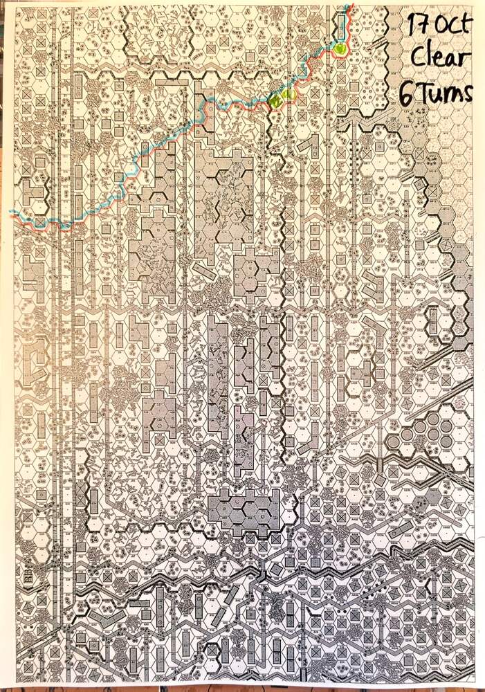 Day one - 17 Oct, German Assault, Clear, Moderate, no wind German at start OB (ELR:4, SAN:3) Rifle 1st, 2nd, 3rd Coy, Sturm 1st Coy, Pz IIIL pltn, Stuka (3), OBA: Btln MTR 80+mm, two Pre-Registered Hexes & Offb´d Observer. Germ OB: 11 Leaders, AFVs 3 Pz IIIL, 48 sq-eq (12x 5-4-8 Elite, 36x 4-6-7 First Line), 20 SWs (4 MMG, 8 LMG, 3 ATR, 3 Lt MTR, 2 DC). Russ at start OB (ELR:3, SAN:4) Rifle 1st, 2nd, 3rd (R), 4th (R) Coy, SMG 1st Coy, 2 AT 45LL; 50 FPP & 5 Fort Loc. Russ OB 8 Leaders, Guns 2 AT 45LL, 58 Sq-eq (2x 228 Crews, 48x 4-4-7 1st-Line, 9x 5-2-7 1st-Line), 20 SWs (4 MMG, 8 LMG, 4 ATR, 4 Lt MTR). AFTERMATH (6 Turns): The Germans prepared for their assault into the Barrikady district. The attack would be spearheaded by one Sturm Coy and by three rifle companies — a massed assault force of 500 battle-hardened soldiers from the 6th Army. They were supported by a platoon of Panzer IIIL tanks, Stuka dive-bombers, and well-coordinated observed artillery fire that had been meticulously planned. Opposing them, the Soviets had roughly 350 men holding the forward line and another 250 in a reserve position farther back — a total defensive strength of about 600 troops. Their position was anchored by two 45 mm anti-tank guns, fortifications and had booby-trapped the area. At first light, the professionals of the 6th Army launched their push along the entire front. German stormtroopers, backed by the scream of Stukas and the thunder of artillery, smashed into the Soviet positions. The forward Soviet line was quickly overrun and evicted in a whirlwind of grenades and close-quarters combat. The surviving defenders were forced to fall back and frantically organize a second line of defense. That second line, too, crumbled under the relentless German onslaught. The Soviets suffered horrendous losses — entire platoons wiped out by concentrated fire, building after building. Then, suddenly, the German storm tactics ground to a halt. Ammunition shortages, exacerbated by the brutal fighting. As the assault waves paused to resupply, a radio message crackled from the rear: the battalion chef reported that supper was ready. Exhausted soldiers exchanged grim, ironic glances. In the midst of hell, the war would wait for dinner. The surviving Soviets regrouped, knowing the next German push would come soon. Call for reinforcement was requested send anything!!! The reply was "Militia 1st Coy is activated" in silence the Russian survivors thought - "will that help". Germ Casualties: 2 Ldr, 6 Squad-equivalents, 1 SW. Russ Cas: 3 Ldr, 24 Squad-equivalents, 7 SWs. Germ OB, end of 17 Oct (SAN:2) 9 Ldr, AFVs 3 Pz IIIL, 42 Squad-equivalents (8.5 Elite, 33.5 1st/2nd-Line), 19 SWs (4 MMG, 8 LMG, 2 ATR, 3 Lt MTR, 2 DC). Russ OB, end of 17 Oct (SAN:3) 5 Leaders, Guns 2 AT 45LL, 34 Squad-equivalents (2 Crews, 2 Elite, 27 1st-Line, 4 Conscripts), 13 SWs (3 MMG, 5 LMG, 3 ATR, 2 Lt MTR).