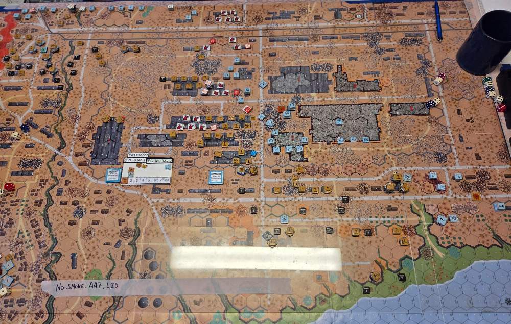 August 11Aug 11 Author comment_38149 Day 8 (of 11) - 24 October, Germ Assault, Overcast, Moderate, No Wind. Germ Reinforcements: Rifle 6th Coy & Rifle 7th Coy. German OB (ELR:4, SAN:2) 19 Ldr, Guns PaK 40, GrW 34, INF 75mm, AFVs Pz IIIL, 63 Sq-eq (7 Crews, 6.5 AE, 17 Elite, 36 1st/2nd-Line), 39 SWs (2 HMG, 8 MMG, 15 LMG, 2 ATR, 2 Lt MTR, 4 FT, 6 DC). Russ Reinforcements: Rifle 7th Coy (R) & Rifle 8th Coy (R), Hvy Weapon 2nd Pltn, Fortifications: 40x ?. Russian OB (ELR:3, SAN:2) 25 Ldr, Guns AT Gun 45mm, 2x MTR 82mm, AFVs T-70 Dug-In, 3x T-34 M41 Dug-In, 94 Sq-eq (11 Crews, 4 AE, 20 Elite, 56.5 1st-Line, 8 Conscripts), 36 SW (3 HMG, 8 MMG, 10 LMG, 4 ATR, 6 Lt MTR, 2 FT, 3 DC). AFTERMATH (6 Turns): The German assault presses relentlessly across all fronts. Two rifle companies advance from the western edge, engaging Russian forces in the Bread Factory sector and crossing the railway embankments under intense machine gun and mortar fire. In the central factory complex, German forces clear a contested factory with minimal Russian resistance, allowing assault teams to split up and push toward the Commissar House and southward across the street into adjacent factories. There, they secure footholds in the halls as Russian defenders, depleted by heavy losses, are forced to retreat. At the Chemist Shop, German crossfire from multiple directions overwhelms two Russian squads and a Commissar, who escape via the sewer system, leaving behind 20 dummie, that the Germans eliminate. However, a hidden T-70 tank, dug in, opens fire and scores a critical hit, destroying a parked Pz IIIL outside the Chemist Shop. The Wehrmacht achieves significant terrain gains across all sectors, partly due to Russian command prioritizing troop preservation and designating key terrain for defensive kill-zones to counter future German assaults. Germ Cas: 3 Ldr, 18.5 Sq-eq, 5 SWs, 1 AFV. Russ Cas: 4 Ldr, 29.5 Sq-eq, 10 SWs, 2 AFVs. German OB, end of 24 Oct (SAN:2) 16 Ldr, Guns PaK 40, GrW 34, INF 75mm, 44.5 Sq-eq (5 Crews, 5 AE, 12 Elite, 25 1st/2nd-Line), 34 SWs (2 HMG, 7 MMG, 15 LMG, 1 ATR, 1 Lt MTR, 3 FT, 5 DC). Russian OB, end of 24 Oct (SAN:2) 21 Ldr, Guns AT Gun 45mm, 2x MTR 82mm, AFVs T-70 Dug-In, T-34 M41 Dug-In, 64.5 Sq-eq (10 Crews, 2.5 AE, 12 Elite, 36.5 1st-Line, 8.5 Conscripts), 26 SW (3 HMG, 5 MMG, 8 LMG, 1 ATR, 6 Lt MTR, 1 FT, 2 DC). LOSSES 17-24 Oct (6+6+6+0+6+6+6+6= 42 Turns) Total German Casualties: 23 Ldr, 98 Sq-Eq, 37 SWs, 6 Guns, 3 AFVs. Total Russian Casualties: 18 Ldr, 193.5 Sq-Eq, 42 SWs, 7 Guns, 7 AFVs. Edited August 11Aug 11 by CTABKA Report