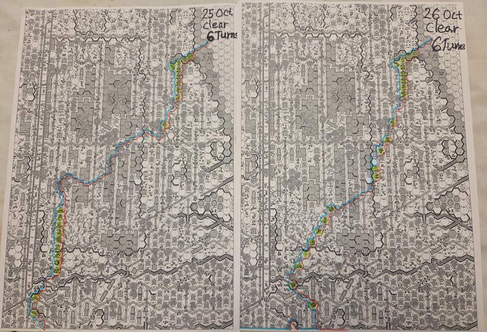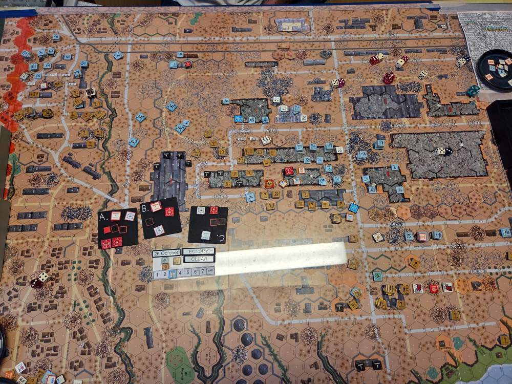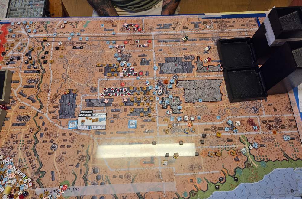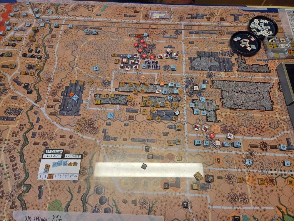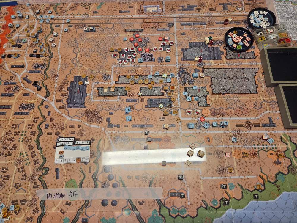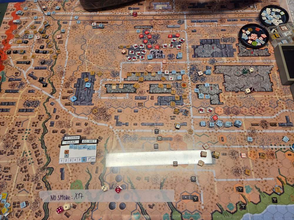 September 20Sep 20 Author comment_38224 Day 9 (of 11) - 25 October, Germ Assault, Overcast, Moderate, No Wind. Germ Reinforcements: Rifle 8th Coy & Rifle 9th Coy, Stuka (3). German OB (ELR:4, SAN:2) 21 Ldr, Guns PaK 40, GrW 34, INF 75mm, 68.5 Sq-eq (5 Crews, 5 AE, 12 Elite, 49 1st/2nd-Line), 44 SWs (2 HMG, 9 MMG, 19 LMG, 3 ATR, 3 Lt MTR, 3 FT, 5 DC). Russ Reinforcements: Rifle 9th Coy (R), Gds SMG 3rd Coy (R), Hvy Weapon 3rd Pltn. Russian OB (ELR:3, SAN:2) 24 Ldr, Guns AT 45mm, 4x MTR 82mm, AFVs T-70 Dug-In, T-34 M41 Dug-In, 88.5 Sq-eq (16 Crews, 2.5 AE, 21 Elite, 48.5 1st-Line, 8.5 Conscripts), 36 SW (5 HMG, 8 MMG, 10 LMG, 2 ATR, 7 Lt MTR, 1 FT, 3 DC). AFTERMATH (6 Turns): A day of brutal attrition unfolds as German assaults falter, with minimal terrain gains or losses across all front sectors. Despite the stalemate, two Russian dug-in tanks and two artillery guns are destroyed. Germ Cas: 7 Ldr, 19.5 Sq-eq, 9 SWs. Russ Cas: 9 Ldr, 24.5 Sq-eq, 11 SWs, 2 Guns, 2 AFVs. German OB, end of 25 Oct (SAN:2) 14 Ldr, Guns PaK 40, GrW 34, INF 75mm, 49 Sq-eq (4 Crews, 2 AE, 10.5 Elite, 34.5 1st/2nd-Line), 35 SWs (2 HMG, 6 MMG, 19 LMG, 1 ATR, 2 Lt MTR, 2 FT, 3 DC). Russian OB, end of 25 Oct (SAN:2) 15 Ldr, Guns AT 45mm, 2x MTR 82mm, AFVs T-70 Dug-In, T-34 M41 Dug-In, 64 Sq-eq (13 Crews, 1.5 AE, 15 Elite, 29.5 1st-Line, 11.5 Conscripts), 36 SW (5 HMG, 8 MMG, 10 LMG, 2 ATR, 7 Lt MTR, 1 FT, 3 DC). LOSSES 17-25 Oct (6+6+6+0+6+6+6+6+6= 48 Turns) Total German Casualties: 30 Ldr, 117.5 Sq-Eq, 46 SWs, 6 Guns, 3 AFVs. Total Russian Casualties: 27 Ldr, 218 Sq-Eq, 53 SWs, 9 Guns, 9 AFVs. Edited October 9Oct 9 by CTABKA Report