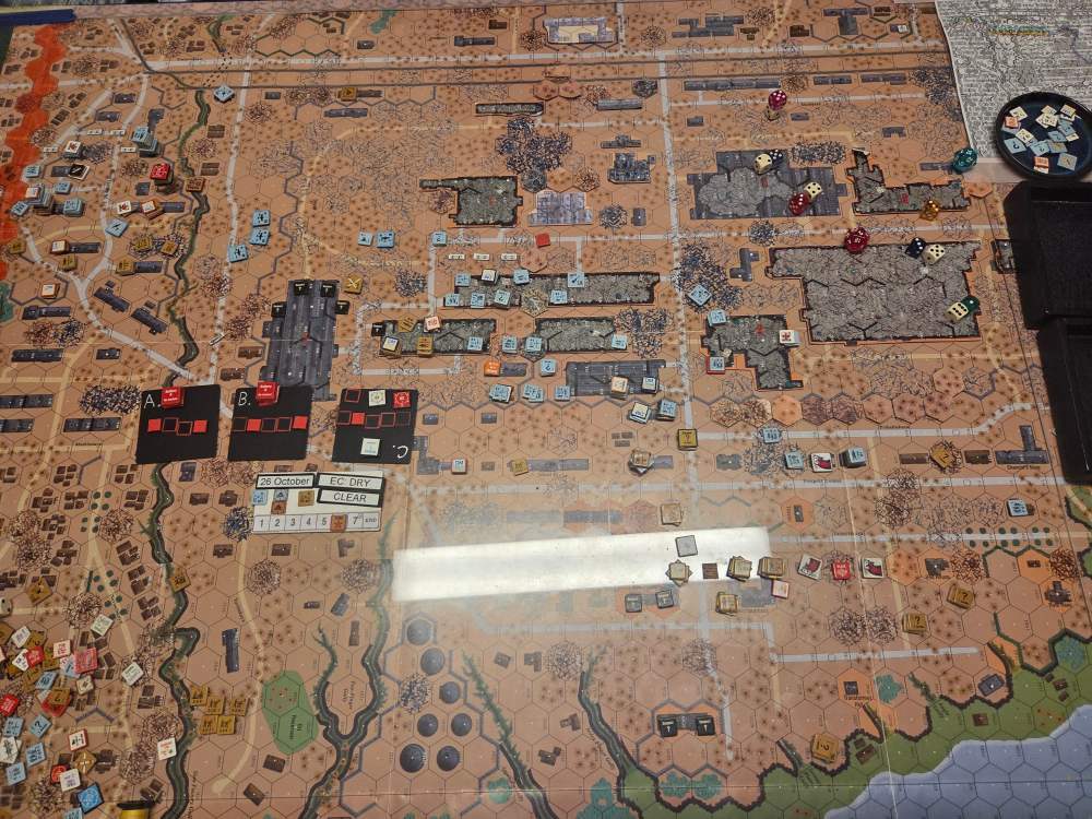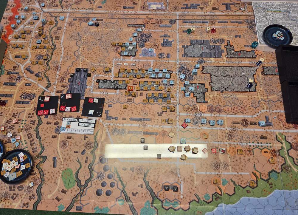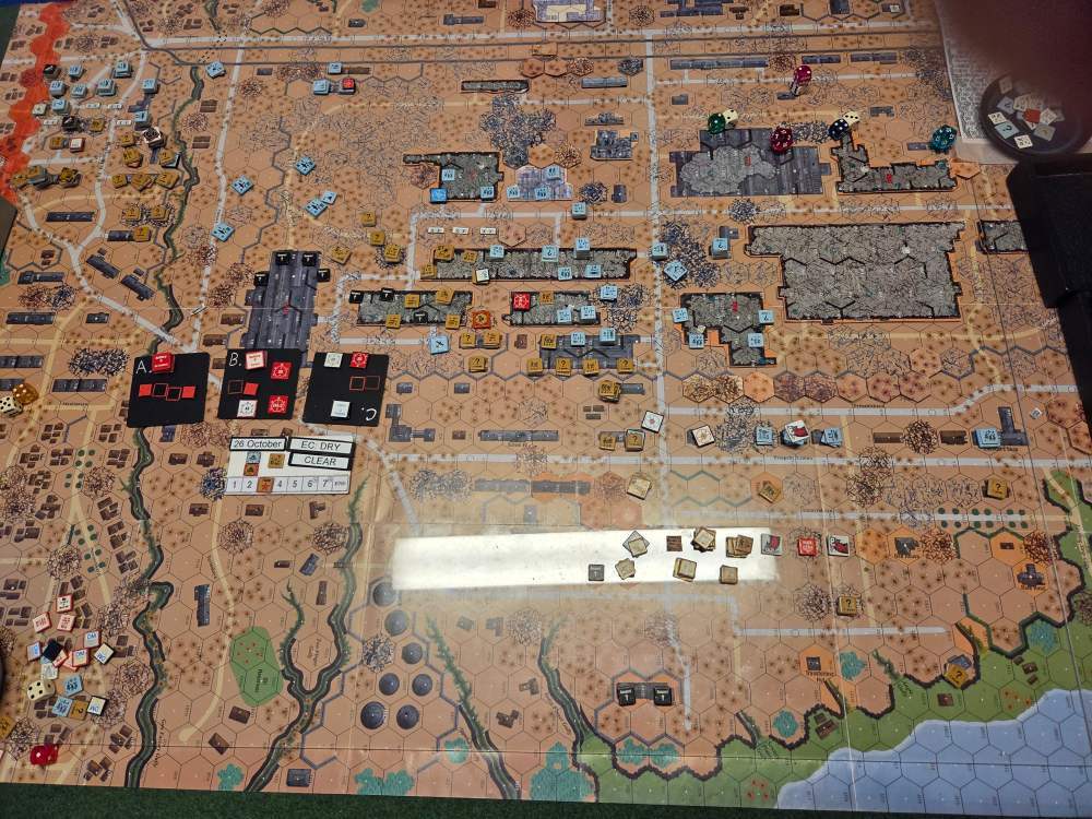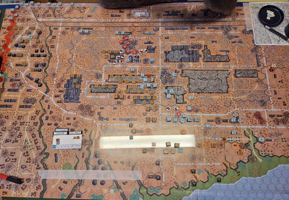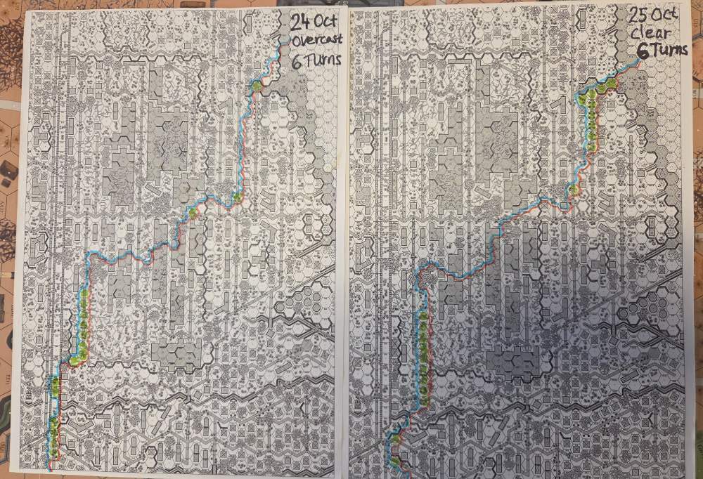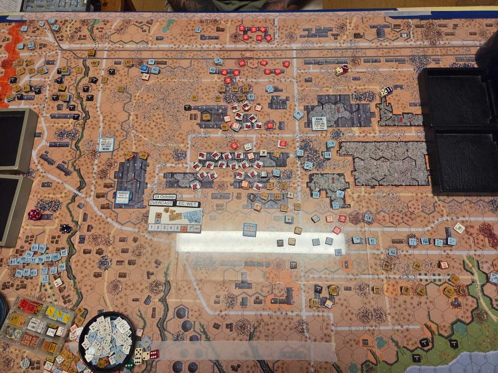 September 20Sep 20 Author comment_38224 Day 9 (of 11) - 25 October, Germ Assault, Overcast, Moderate, No Wind. Germ Reinforcements: Rifle 8th Coy & Rifle 9th Coy, Stuka (3). German OB (ELR:4, SAN:2) 21 Ldr, Guns PaK 40, GrW 34, INF 75mm, 68.5 Sq-eq (5 Crews, 5 AE, 12 Elite, 49 1st/2nd-Line), 44 SWs (2 HMG, 9 MMG, 19 LMG, 3 ATR, 3 Lt MTR, 3 FT, 5 DC). Russ Reinforcements: Rifle 9th Coy (R), Gds SMG 3rd Coy (R), Hvy Weapon 3rd Pltn. Russian OB (ELR:3, SAN:2) 24 Ldr, Guns AT 45mm, 4x MTR 82mm, AFVs T-70 Dug-In, T-34 M41 Dug-In, 88.5 Sq-eq (16 Crews, 2.5 AE, 21 Elite, 48.5 1st-Line, 8.5 Conscripts), 36 SW (5 HMG, 8 MMG, 10 LMG, 2 ATR, 7 Lt MTR, 1 FT, 3 DC). AFTERMATH (6 Turns): A day of brutal attrition unfolds as German assaults falter, with minimal terrain gains or losses across all front sectors. Despite the stalemate, two Russian dug-in tanks and two artillery guns are destroyed. Germ Cas: 7 Ldr, 19.5 Sq-eq, 9 SWs. Russ Cas: 9 Ldr, 24.5 Sq-eq, 11 SWs, 2 Guns, 2 AFVs. German OB, end of 25 Oct (SAN:2) 14 Ldr, Guns PaK 40, GrW 34, INF 75mm, 49 Sq-eq (4 Crews, 2 AE, 10.5 Elite, 34.5 1st/2nd-Line), 35 SWs (2 HMG, 6 MMG, 19 LMG, 1 ATR, 2 Lt MTR, 2 FT, 3 DC). Russian OB, end of 25 Oct (SAN:2) 15 Ldr, Guns AT 45mm, 2x MTR 82mm, AFVs T-70 Dug-In, T-34 M41 Dug-In, 64 Sq-eq (13 Crews, 1.5 AE, 15 Elite, 29.5 1st-Line, 11.5 Conscripts), 36 SW (5 HMG, 8 MMG, 10 LMG, 2 ATR, 7 Lt MTR, 1 FT, 3 DC). LOSSES 17-25 Oct (6+6+6+0+6+6+6+6+6= 48 Turns) Total German Casualties: 30 Ldr, 117.5 Sq-Eq, 46 SWs, 6 Guns, 3 AFVs. Total Russian Casualties: 27 Ldr, 218 Sq-Eq, 53 SWs, 9 Guns, 9 AFVs. Edited October 9Oct 9 by CTABKA Report