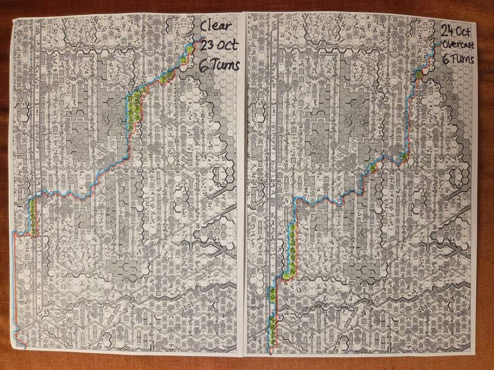 October 9Oct 9 Author comment_38251 Day 10 (of 11) - 26 October, German Assault, Clear, Dry, No Wind Germ Reinforcements: Sturm 5th Coy, OBA: Hvy Arty 150+mm directed by Spotter Plane, Early STUKA (4). German OB (ELR:4, SAN:2) 17 Ldr, Guns PaK 40, GrW 34, INF 75mm, 61 Sq-eq (4 Crews, 2 AE, 22.5 Elite, 34.5 1st/2nd-Line), 40 SWs (2 HMG, 7 MMG, 21 LMG, 1 ATR, 2 Lt MTR, 2 FT, 5 DC). Russ Reinforcements: Gds SMG 3rd Coy (R), ART Gun Battery, Fort 160 FPP. OBA id: A, Btln MTR 80+mm with Pre-Reg Hex (Retained), OBA id: B, Btln MTR 80+mm. Russian OB (ELR:3, SAN:2) 16 Ldr, Guns AT 45mm, 2x MTR 82mm, 4x ART 76L, 75 Sq-eq (17 Crews, 1.5 AE, 24 Elite, 29.5 1st-Line, 11.5 Conscripts), 26 SW (4 HMG, 6 MMG, 6 LMG, 1 ATR, 5 Lt MTR, 4 DC). AFTERMATH (6 Turns): Germ Cas: 5 Ldr, 16.5 Sq-eq, 7 SWs. Russ Cas: 3 Ldr, 35.5 Sq-eq, 11 SWs, 4 Guns. German OB, end of 26 Oct (SAN:2) 14 17 Ldr, Guns PaK 40, GrW 34, INF 75mm, 61 Sq-eq (4 Crews, 2 AE, 22.5 Elite, 34.5 1st/2nd-Line), 40 SWs (2 HMG, 7 MMG, 21 LMG, 1 ATR, 2 Lt MTR, 2 FT, 5 DC). Russian OB, end of 26 Oct (SAN:2) 13 Ldr, Guns MTR 82mm, 2x ART 76L, 39.5 Sq-eq (12 Crews, 1 AE, 13.5 Elite, 13.5 1st-Line, 5.5 Conscripts), 15 SW (3 HMG, 2 MMG, 5 LMG, 3 Lt MTR, 2 DC). LOSSES 17-26 Oct (6+6+6+0+6+6+6+6+6+6= 54 Turns) Total German Casualties: 35 Ldr, 134 Sq-Eq, 53 SWs, 6 Guns, 3 AFVs. Total Russian Casualties: 30 Ldr, 253.5 Sq-Eq, 64 SWs, 13 Guns, 9 AFVs. Edited October 17Oct 17 by CTABKA Report