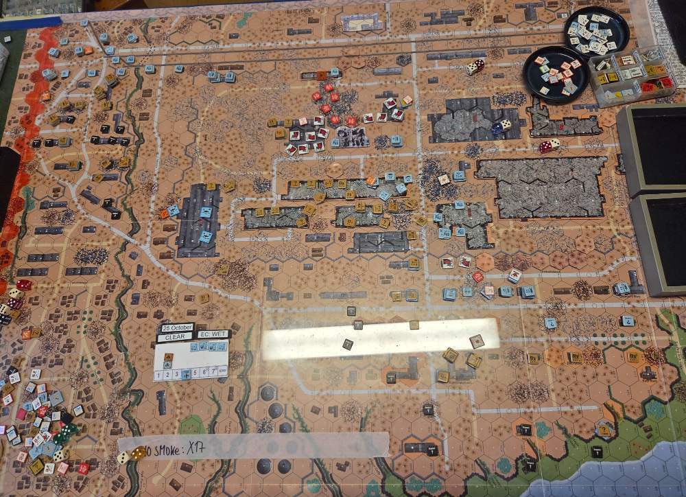 May 10May 10 Author comment_38017 Day three - 19 October, German Assault, Clear, Wet, no wind. Germ Reinforcements: Sturm 3rd Coy, early STUKA, OBA: Two Btln MTR 80+mm each with an Offb'd Observer. German OB (ELR:4, SAN:2) 17 Ldr, 2 Pz IIIL, 49 Squad-equivalents (31 Elite, 18 1st/2nd-Line), 25 SWs (1 HMG, 5 MMG, 11 LMG, 1 ATR, 2 Lt MTR, 5 DC). Russian Reinforcements: Militia 2nd Coy, Rifle 5th (R) Coy, AT Battery, SAN increase, OBA: Two Lt Arty 70+mm. Russian OB (ELR:3, SAN:4) 15 Ldr, 5x AT Guns 45mm, 78.5 Squad-equivalents (5 Crews, 2 Elite, 47.5 1st-Line, 26.5 Conscripts), 16 SW (1 MMG, 7 LMG, 3 ATR, 5 Lt MTR). AFTERMATH (6 Turns): Third day, the German assault continues. The onslaught is brutal and supported by two German Btln MTR that call in artillery blasts along the railway embankments and upon the Chemist Shop while the Russian call in OBA in the form of two Lt Arty one in front of the Chemist Shop and the other along the railway embankments. Although, most of the fighting and losses occurred in the Red Halls were the Germans slowly grind forward and pushed deeper into the factory complex. After today's battle on the fourth day of the CG an Idle day occurred as fresh reinforcements was brought forward. Germ Cas: 7 Ldr, 14.5 Sq-eq, 8 SWs, 1 AFV Russ Cas: 1 Ldr, 25 Sq-eq, 4 SWs. German OB, end of 19 Oct (SAN:2) 10 Ldr, 1 Pz IIIL, 34.5 Squad-equivalents (24 Elite, 10.5 1st/2nd-Line), 17 SWs (1 HMG, 4 MMG, 9 LMG, 3 DC). Russian OB, end of 19 Oct (SAN:2) 14 Ldr, 5x AT Guns 45mm, 53.5 Squad-equivalents (5 Crews, 3 Elite, 28.5 1st-Line, 19.5 Conscripts), 12 SW (1 MMG, 7 LMG, 2 ATR, 2 Lt MTR). LOSSES 17-19 Oct (6+6+6= 18 Turns) Total German Casualties: 10 Ldr, 37.5 Sq-Eq, 14 SWs, 2 AFVs. Total Russian Casualties: 3 Ldr, 66.5 Sq-Eq, 13 SWs, 1 Gun, 3 AFVs. Edited June 22Jun 22 by CTABKA Report