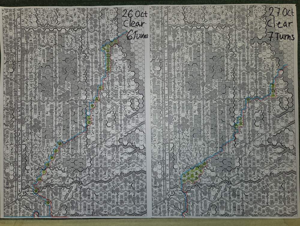 September 20, 2025Sep 20 Author comment_38224 Day 9 (of 11) - 25 October, Germ Assault, Overcast, Moderate, No Wind. Germ Reinforcements: Rifle 8th Coy & Rifle 9th Coy, Stuka (3). German OB (ELR:4, SAN:2) 21 Ldr, Guns PaK 40, GrW 34, INF 75mm, 68.5 Sq-eq (5 Crews, 5 AE, 12 Elite, 49 1st/2nd-Line), 44 SWs (2 HMG, 9 MMG, 19 LMG, 3 ATR, 3 Lt MTR, 3 FT, 5 DC). Russ Reinforcements: Rifle 9th Coy (R), Gds SMG 3rd Coy (R), Hvy Weapon 3rd Pltn. Russian OB (ELR:3, SAN:2) 24 Ldr, Guns AT 45mm, 4x MTR 82mm, AFVs T-70 Dug-In, T-34 M41 Dug-In, 88.5 Sq-eq (16 Crews, 2.5 AE, 21 Elite, 48.5 1st-Line, 8.5 Conscripts), 36 SW (5 HMG, 8 MMG, 10 LMG, 2 ATR, 7 Lt MTR, 1 FT, 3 DC). AFTERMATH (6 Turns): A day of brutal attrition unfolds as German assaults falter, with minimal terrain gains or losses across all front sectors. Despite the stalemate, two Russian dug-in tanks and two artillery guns are destroyed. Germ Cas: 7 Ldr, 19.5 Sq-eq, 9 SWs. Russ Cas: 9 Ldr, 24.5 Sq-eq, 11 SWs, 2 Guns, 2 AFVs. German OB, end of 25 Oct (SAN:2) 14 Ldr, Guns PaK 40, GrW 34, INF 75mm, 49 Sq-eq (4 Crews, 2 AE, 10.5 Elite, 34.5 1st/2nd-Line), 35 SWs (2 HMG, 6 MMG, 19 LMG, 1 ATR, 2 Lt MTR, 2 FT, 3 DC). Russian OB, end of 25 Oct (SAN:2) 15 Ldr, Guns AT 45mm, 2x MTR 82mm, AFVs T-70 Dug-In, T-34 M41 Dug-In, 64 Sq-eq (13 Crews, 1.5 AE, 15 Elite, 29.5 1st-Line, 11.5 Conscripts), 36 SW (5 HMG, 8 MMG, 10 LMG, 2 ATR, 7 Lt MTR, 1 FT, 3 DC). LOSSES 17-25 Oct (6+6+6+0+6+6+6+6+6= 48 Turns) Total German Casualties: 30 Ldr, 117.5 Sq-Eq, 46 SWs, 6 Guns, 3 AFVs. Total Russian Casualties: 27 Ldr, 218 Sq-Eq, 53 SWs, 9 Guns, 9 AFVs. Edited October 9, 2025Oct 9 by CTABKA Report