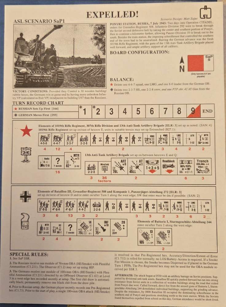 August 15Aug 15 Author comment_38158 SaP1 Expelled! https://www.aslscenarioarchive.com/scenario.php?id=67120 I play the Russ. vs J Sahlin, Germ. Roar G7-R1 could aswell be G8-R0 after going over the scenario design, seems very pro-German. Have tried to balance it and updated it with some Leaflet House Rules, before playing it for the first time. Edited September 3Sep 3 by CTABKA Report