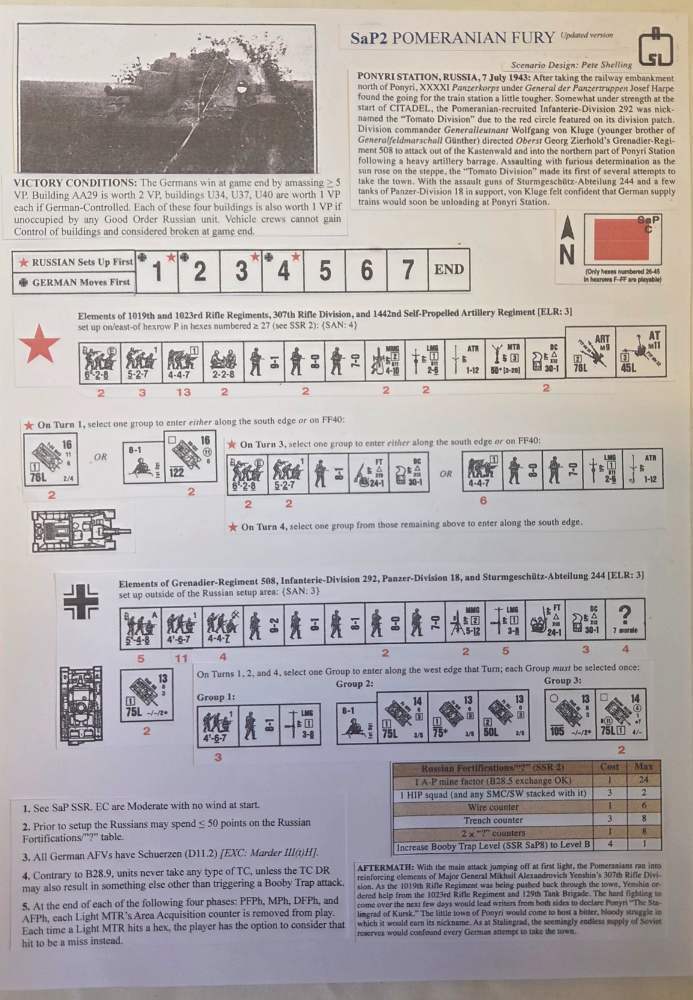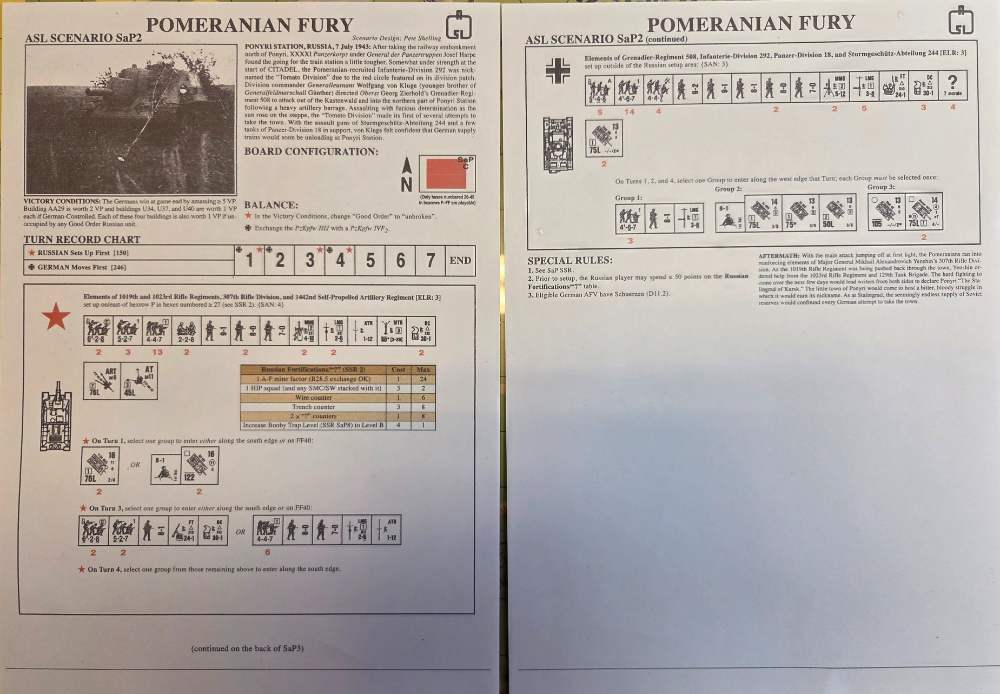 August 24Aug 24 Author comment_38170 SaP2 Pomeranian Fury https://www.aslscenarioarchive.com/scenario.php?id=67121 Roar G3-R1 could as well be G4-R0, the Russ Vict is not a true victory (See AAR ASL-ARCHIVE). After going over the scenario design, seems very pro-German. Have tried to balance it and updated its VCs and with some Leaflet House Rules, before playing it for the first time. Of the 11 scenarios, one of them, SaP 2 have been given the layout-of-two-pages (heard someone calling it the “death kiss”). Scissors, glue, two A4 color copies and 30 minutes, crude fast work, all the updates are added: VCs, Germ OB, SSRs. Edited August 24Aug 24 by CTABKA Report